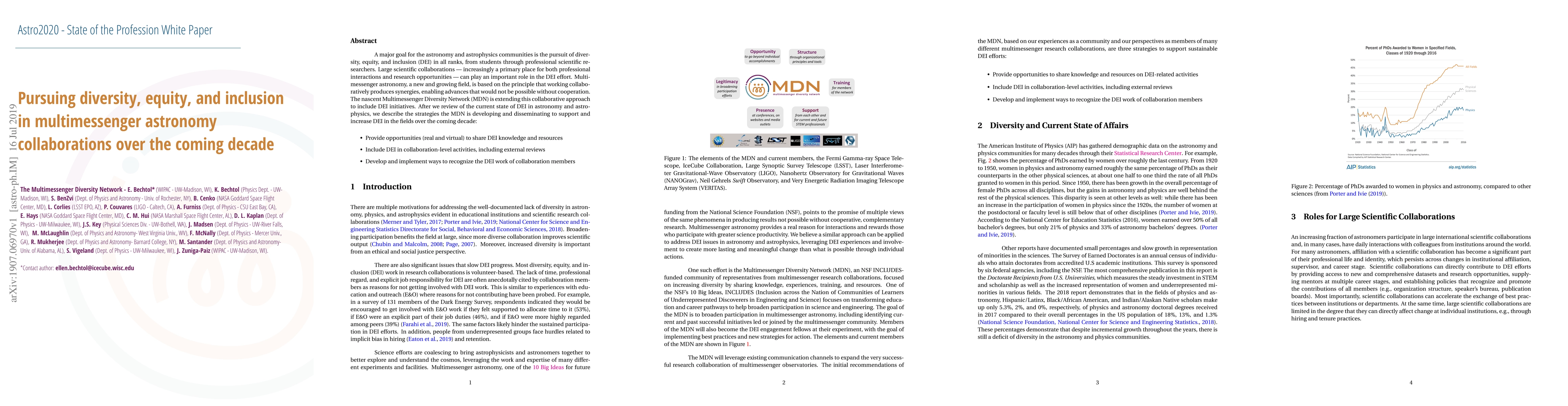 A major goal for the astronomy and astrophysics communities is the pursuit of diversity, equity, and inclusion (DEI) in all ranks, from students through professional scientific researchers. Large scientific collaborations - increasingly a primary place for both professional interactions and research opportunities - can play an important role in the DEI effort. Multimessenger astronomy, a new and growing field, is based on the principle that working collaboratively produces synergies, enabling advances that would not be possible without cooperation. The nascent Multimessenger Diversity Network (MDN) is extending this collaborative approach to include DEI initiatives. After we review of the current state of DEI in astronomy and astrophysics, we describe the strategies the MDN is developing and disseminating to support and increase DEI in the fields over the coming decade: provide opportunities (real and virtual) to share DEI knowledge and resources, include DEI in collaboration-level activities, including external reviews, and develop and implement ways to recognize the DEI work of collaboration members.