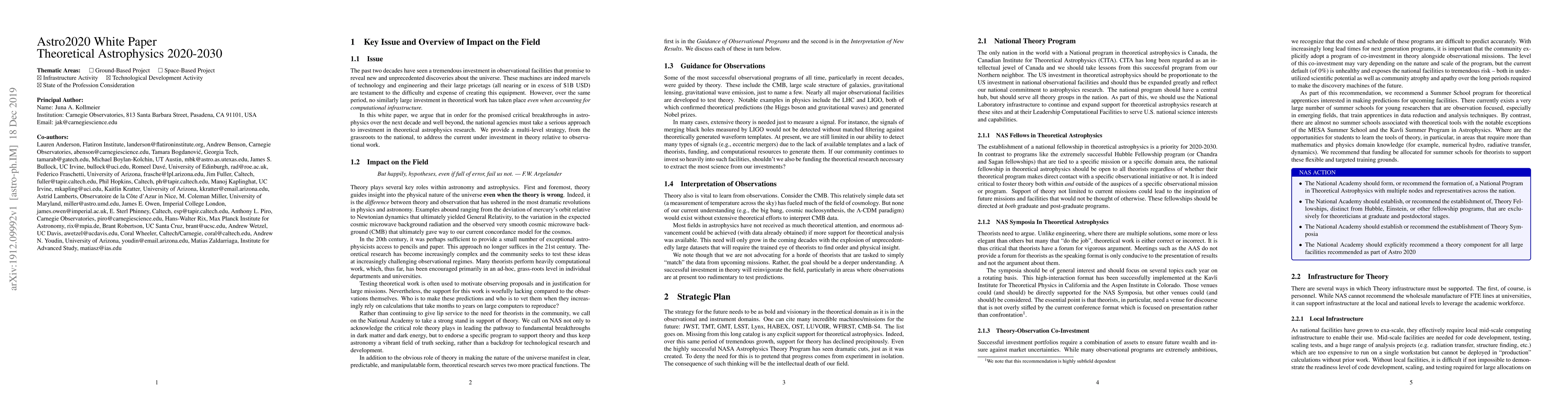 A 2020 white paper calls for increased investment in theoretical astrophysics research to reach critical breakthroughs, as compared to observational facilities.