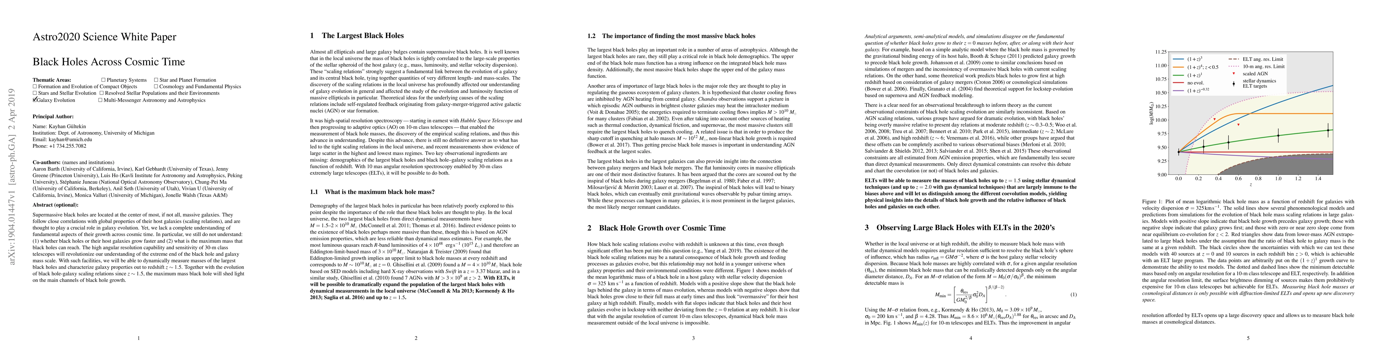This paper discusses the need for advanced telescopes to understand supermassive black holes' growth and their relationship with host galaxies, aiming to resolve uncertainties about their relative growth rates and maximum mass. The 30-m class telescopes' capabilities are expected to revolutionize this understanding by measuring black hole masses and characterizing galaxy properties at high redshifts.