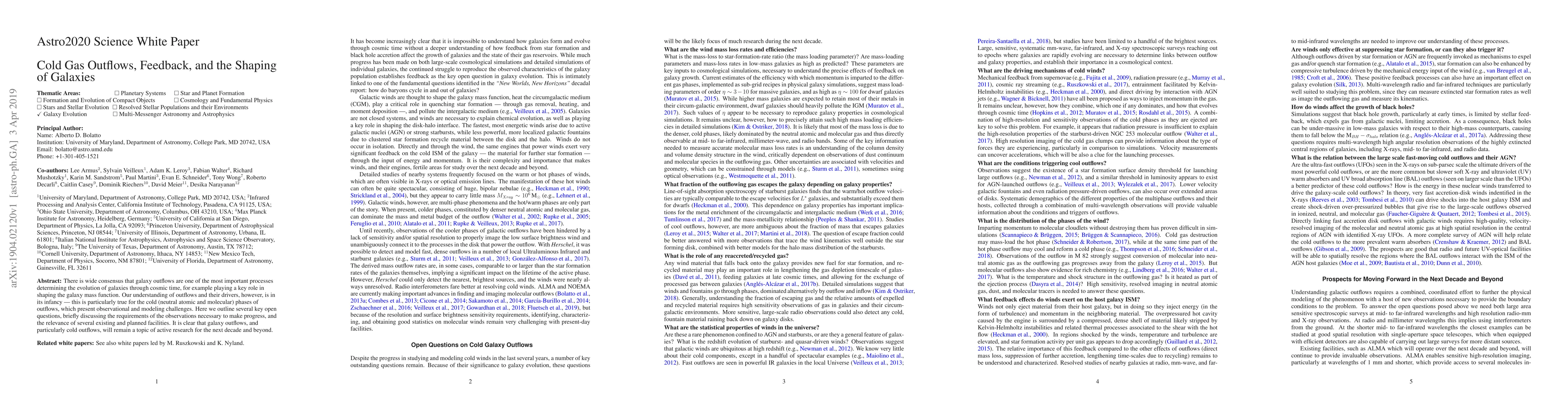 There is wide consensus that galaxy outflows are one of the most important processes determining the evolution of galaxies through cosmic time, for example playing a key role in shaping the galaxy mass function. Our understanding of outflows and their drivers, however, is in its infancy --- this is particularly true for the cold (neutral atomic and molecular) phases of outflows, which present observational and modeling challenges. Here we outline several key open questions, briefly discussing the requirements of the observations necessary to make progress, and the relevance of several existing and planned facilities. It is clear that galaxy outflows, and particularly cold outflows, will remain a topic of active research for the next decade and beyond.