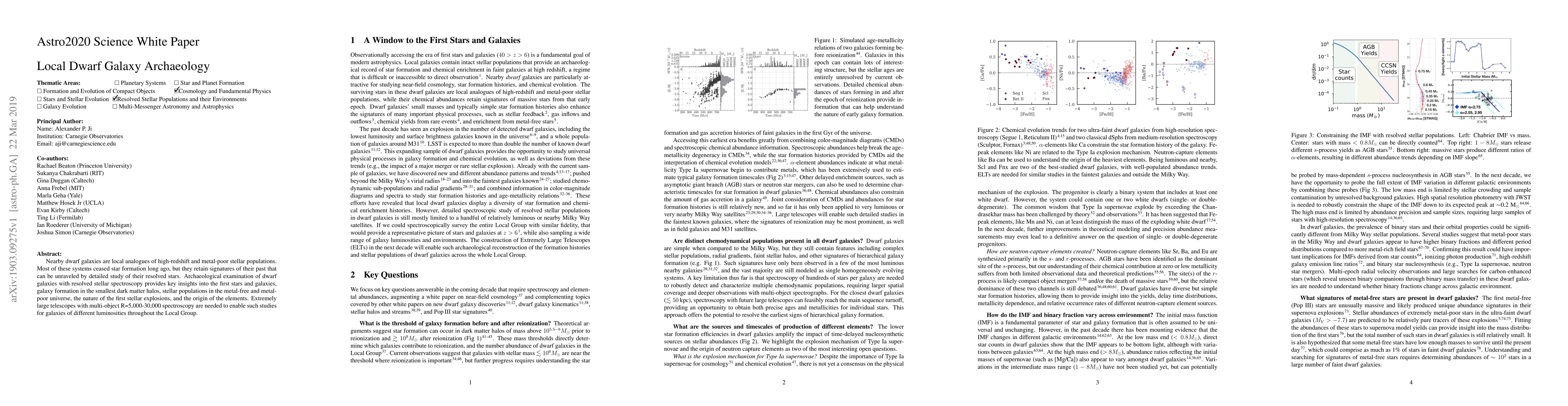 Nearby dwarf galaxies are local analogues of high-redshift and metal-poor stellar populations. Most of these systems ceased star formation long ago, but they retain signatures of their past that can be unraveled by detailed study of their resolved stars. Archaeological examination of dwarf galaxies with resolved stellar spectroscopy provides key insights into the first stars and galaxies, galaxy formation in the smallest dark matter halos, stellar populations in the metal-free and metal-poor universe, the nature of the first stellar explosions, and the origin of the elements. Extremely large telescopes with multi-object R=5,000-30,000 spectroscopy are needed to enable such studies for galaxies of different luminosities throughout the Local Group.