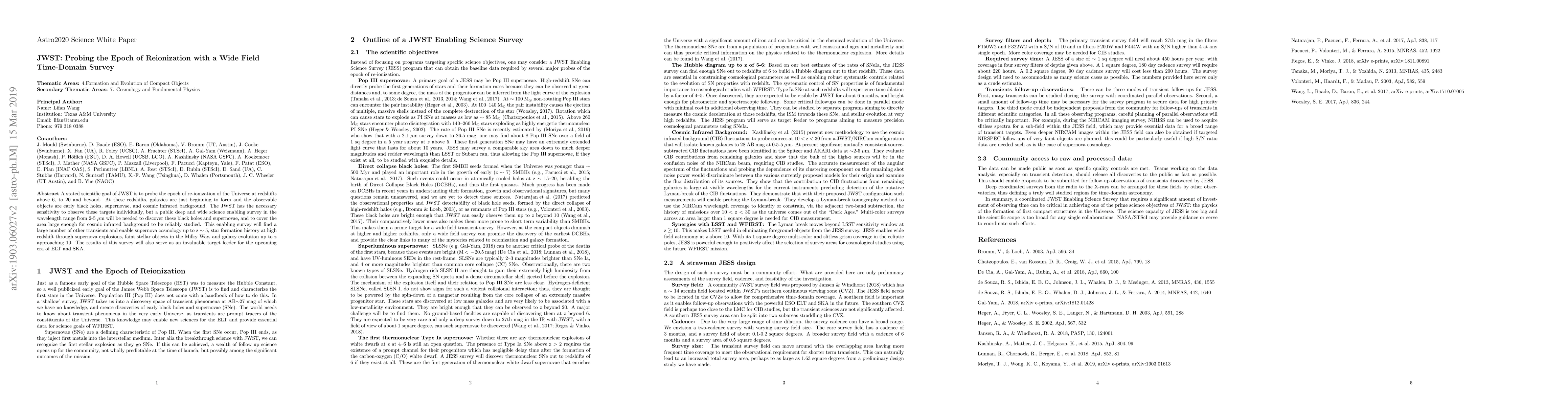 A major scientific goal of JWST is to probe the epoch of re-ionization of the Universe at z above 6, and up to 20 and beyond. At these redshifts, galaxies are just beginning to form and the observable objects are early black holes, supernovae, and cosmic infrared background. The JWST has the necessary sensitivity to observe these targets individually, but a public deep and wide science enabling survey in the wavelength range from 2-5 $\mu$m is needed to discover these black holes and supernovae and to cover the area large enough for cosmic infrared background to be reliably studied. This enabling survey will also discover a large number of other transients and enable sciences such as supernova cosmology up to z $\sim$ 5, star formation history at high redshift through supernova explosions, faint stellar objects in the Milky Way, and galaxy evolution up to z approaching 10. The results of this survey will also serve as an invaluable target feeder for the upcoming era of ELT and SKA.