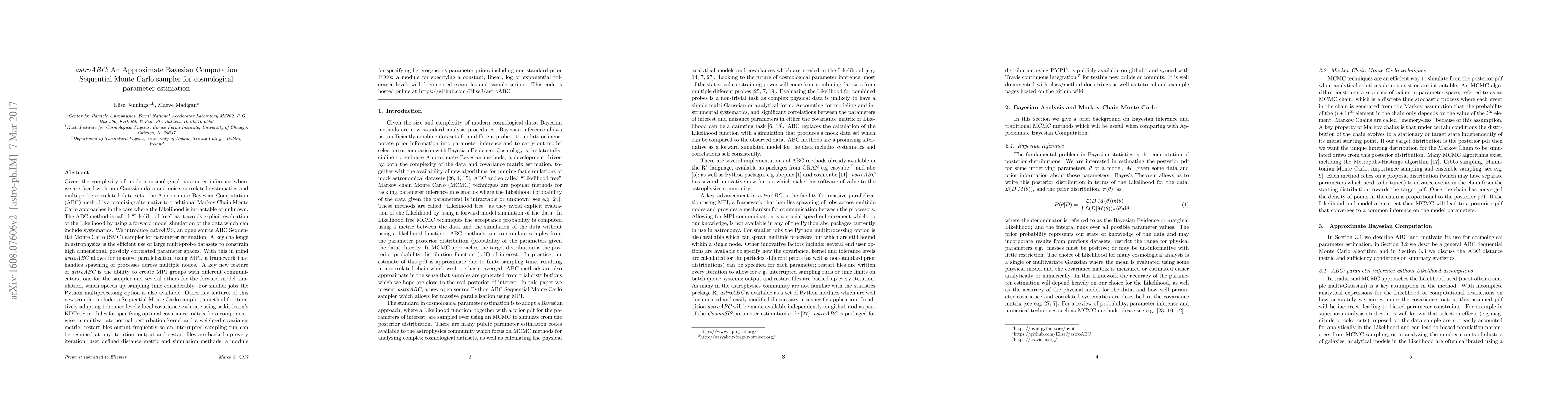 AstroABC is an open-source Approximate Bayesian Computation (ABC) Sequential Monte Carlo (SMC) sampler for cosmological parameter estimation, designed to handle complex, non-Gaussian data and correlated systematics. It offers parallelization through MPI and multiprocessing for efficient use of large datasets.
