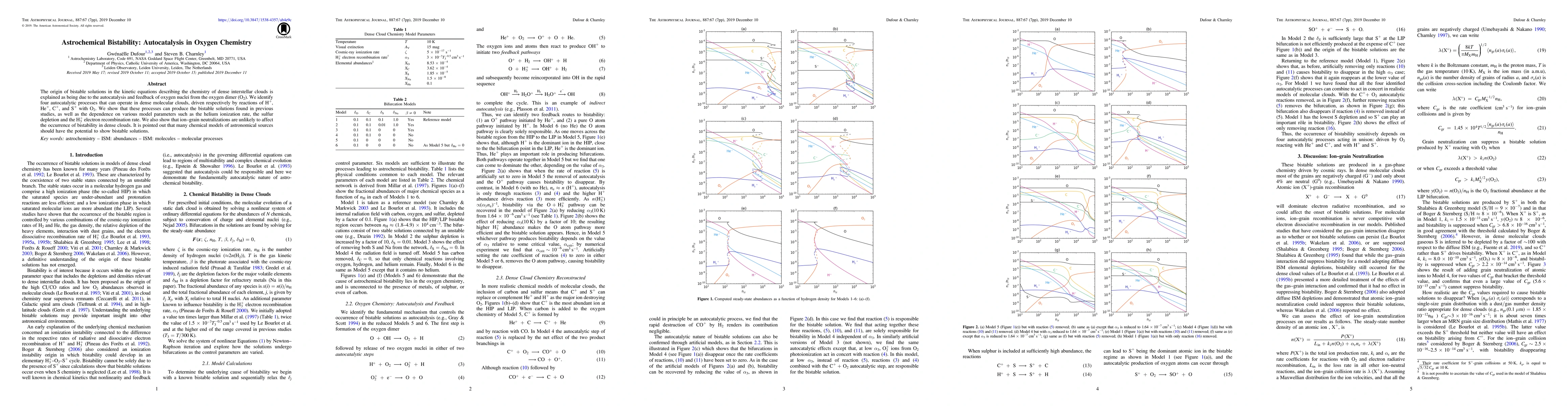 The origin of bistable solutions in the kinetic equations describing the chemistry of dense interstellar clouds is explained as being due to the autocatalysis and feedback of oxygen nuclei from the oxygen dimer (O2). We identify four autocatalytic processes that can operate in dense molecular clouds, driven respectively by reactions of H+, He+, C+, and S+ with O2. We show that these processes can produce the bistable solutions found in previous studies, as well as the dependence on various model parameters such as the helium ionization rate, the sulfur depletion and the {{{H}}}3+ electron recombination rate. We also show that ion-grain neutralizations are unlikely to affect the occurrence of bistability in dense clouds. It is pointed out that many chemical models of astronomical sources should have the potential to show bistable solutions.