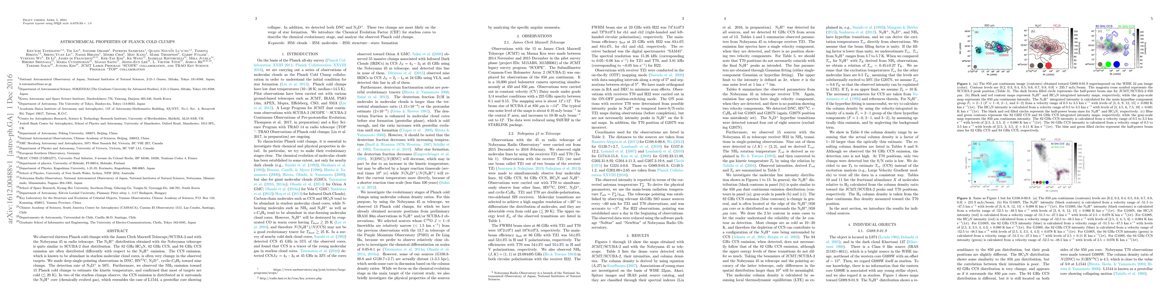 We observed thirteen Planck cold clumps with the James Clerk Maxwell Telescope/SCUBA-2 and with the Nobeyama 45 m radio telescope. The N$_2$H$^+$ distribution obtained with the Nobeyama telescope is quite similar to SCUBA-2 dust distribution. The 82 GHz HC$_3$N, 82 GHz CCS, and 94 GHz CCS emission are often distributed differently with respect to the N$_2$H$^+$ emission. The CCS emission, which is known to be abundant in starless molecular cloud cores, is often very clumpy in the observed targets. We made deep single-pointing observations in DNC, HN$^{13}$C, N$_2$D$^+$, cyclic-C$_3$H$_2$ toward nine clumps. The detection rate of N$_2$D$^+$ is 50\%. Furthermore, we observed the NH$_3$ emission toward 15 Planck cold clumps to estimate the kinetic temperature, and confirmed that most of targets are cold ($\lesssim$ 20 K). In two of the starless clumps observe, the CCS emission is distributed as it surrounds the N$_2$H$^+$ core (chemically evolved gas), which resembles the case of L1544, a prestellar core showing collapse. In addition, we detected both DNC and N$_2$D$^+$. These two clumps are most likely on the verge of star formation. We introduce the Chemical Evolution Factor (CEF) for starless cores to describe the chemical evolutionary stage, and analyze the observed Planck cold clumps.
