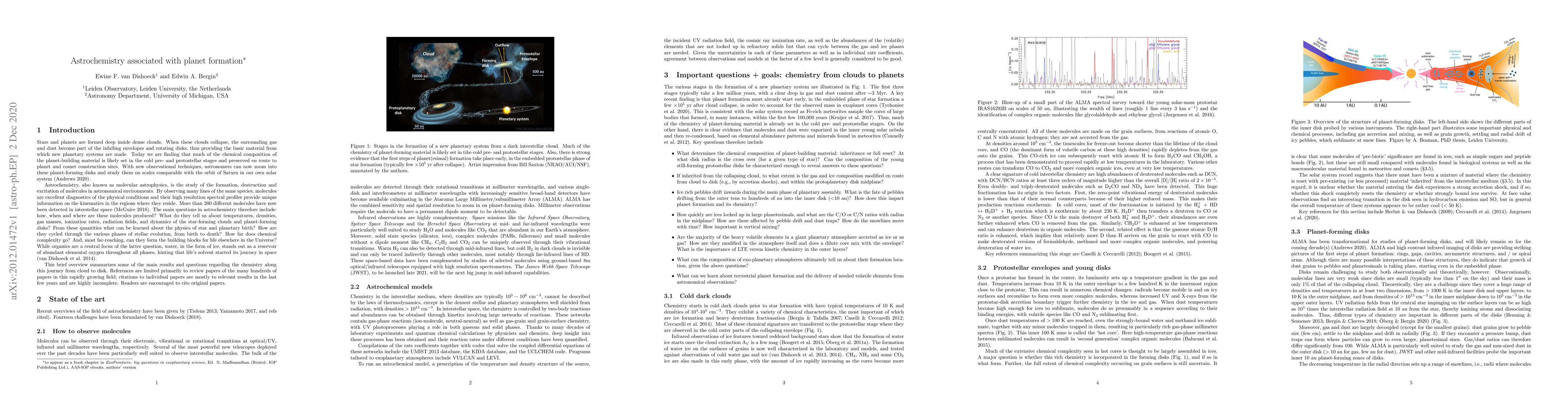 This paper provides a brief summary and overview of the astrochemistry associated with the formation of stars and planets. It is aimed at new researchers in the field to enable them to obtain a quick overview of the landscape and key literature in this rapidly evolving area. The journey of molecules from clouds to protostellar envelopes, disks and ultimately exoplanet atmospheres is described. The importance of the close relation between the chemistry of gas and ice and the physical structure and evolution of planet-forming disks, including the growth and drift of grains and the locking up of elements at dust traps, is stressed. Using elemental abundance ratios like C/O, C/N, O/H in exoplanetary atmospheres to link them to their formation sites is therefore not straightforward. Interesting clues come from meteorites and comets in our own solar system, as well as from the composition of Earth. A new frontier is the analysis of the kinematics of molecular lines to detect young planets in disks. A number of major questions to be addressed in the coming years are formulated, and challenges and opportunities are highlighted.
