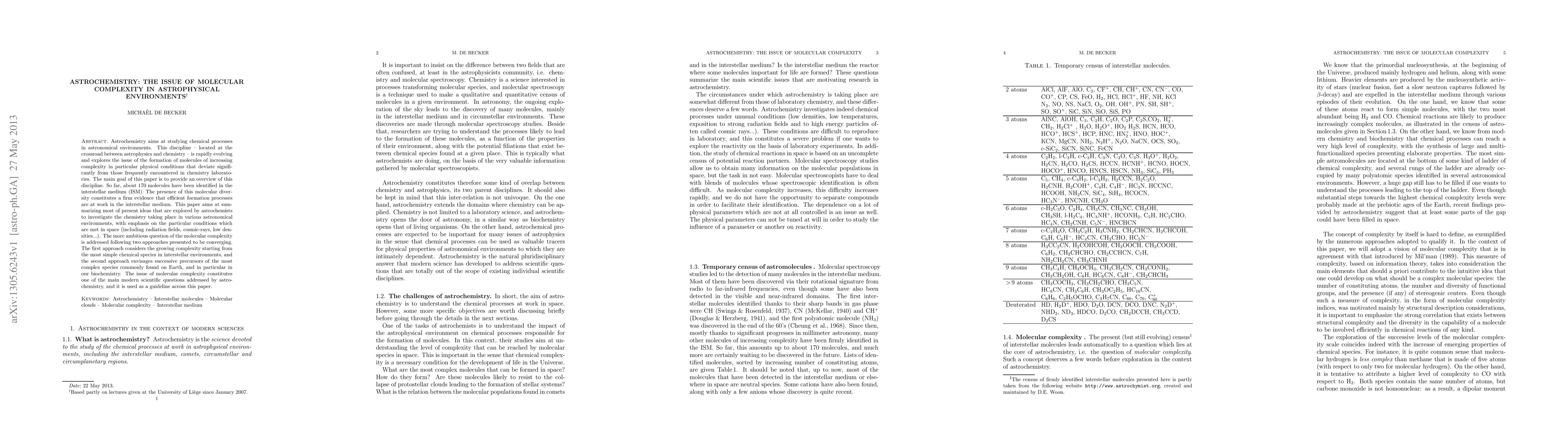This paper provides an overview of astrochemistry, focusing on the formation of increasingly complex molecules in astrophysical environments that differ significantly from terrestrial conditions. It explores the formation processes in the interstellar medium and the converging approaches to understanding molecular complexity, emphasizing the unique physical conditions of space.