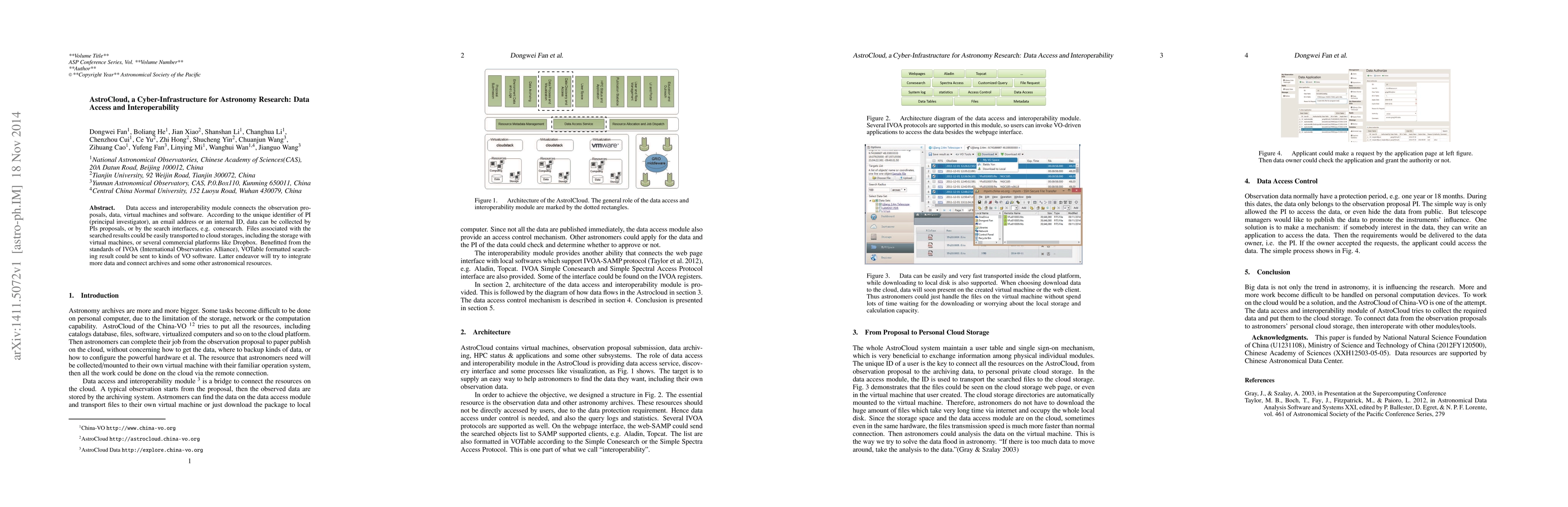 AstroCloud is a cyber-infrastructure that facilitates data access and interoperability for astronomy research, enabling observation proposals, data collection, and seamless integration with cloud storage and virtual machines. It adheres to IVOA standards for VOTable formatted results, enhancing compatibility with various VO software.