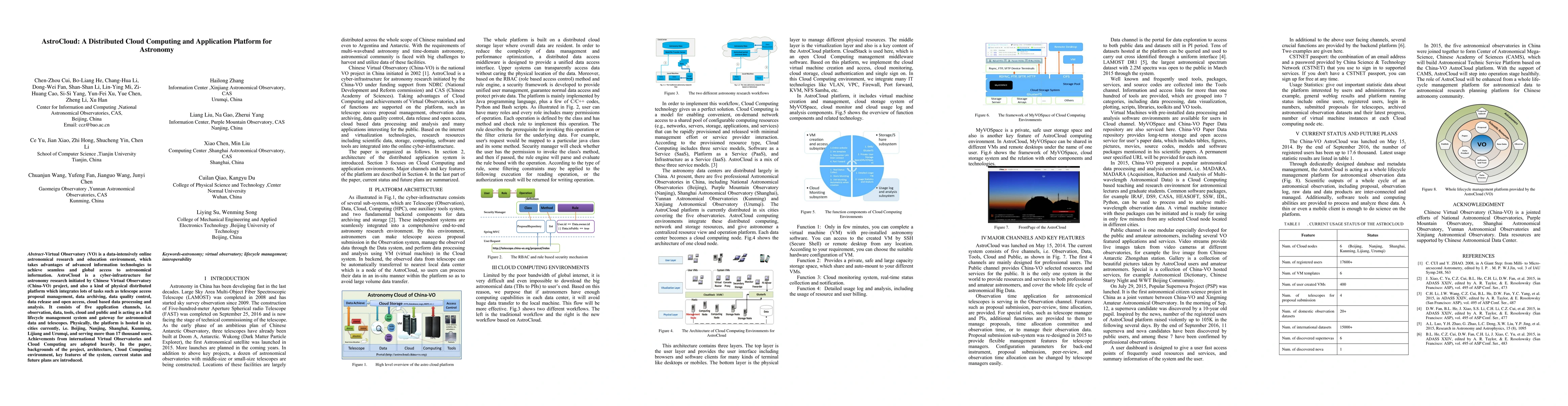 AstroCloud is a distributed cloud computing platform for astronomy research, integrating telescope access, data management, and cloud-based analysis. It serves over 17,000 users across six cities in China and aims to provide a seamless global access to astronomical information.