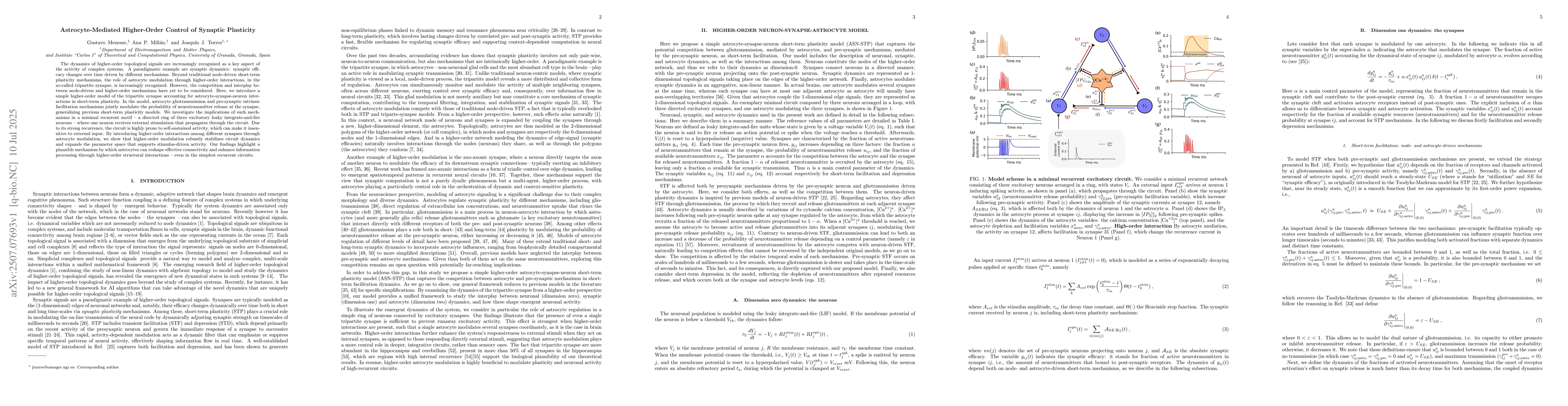 The dynamics of higher-order topological signals are increasingly recognized as a key aspect of the activity of complex systems. A paradigmatic example are synaptic dynamics: synaptic efficacy changes over time driven by different mechanisms. Beyond traditional node-driven short-term plasticity mechanisms, the role of astrocyte modulation through higher-order interactions, in the so-called tripartite synapse, is increasingly recognized. However, the competition and interplay between node-driven and higher-order mechanisms have yet to be considered. Here, we introduce a simple higher-order model of the tripartite synapse accounting for astrocyte-synapse-neuron interactions in short-term plasticity. In the model, astrocyte gliotransmission and pre-synaptic intrinsic facilitation mechanisms jointly modulate the probability of neurotransmitter release at the synapse, generalizing previous short-term plasticity models. We investigate the implications of such mechanisms in a minimal recurrent motif -- a directed ring of three excitatory leaky integrate-and-fire neurons -- where one neuron receives external stimulation that propagates through the circuit. Due to its strong recurrence, the circuit is highly prone to self-sustained activity, which can make it insensitive to external input. By introducing higher-order interactions among different synapses through astrocyte modulation, we show that higher-order modulation robustly stabilizes circuit dynamics and expands the parameter space that supports stimulus-driven activity. Our findings highlight a plausible mechanism by which astrocytes can reshape effective connectivity and enhance information processing through higher-order structural interactions -- even in the simplest recurrent circuits.