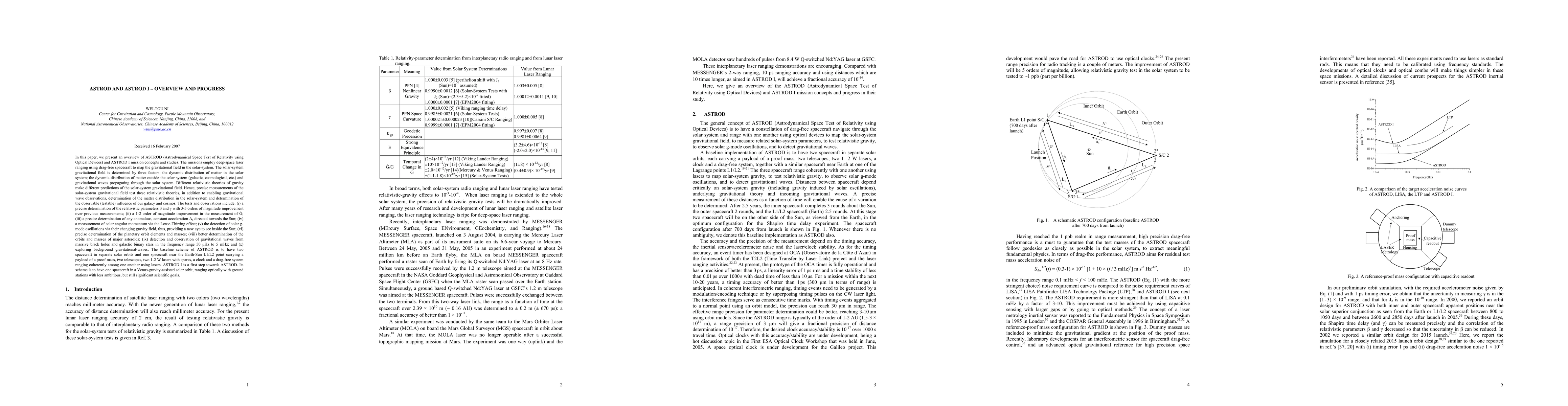 This paper provides an overview of the ASTROD and ASTROD I missions, which aim to map the solar-system gravitational field using deep-space laser ranging and drag-free spacecraft. The missions seek to test various relativistic gravity theories through precise measurements of solar-system gravitational dynamics and gravitational waves.