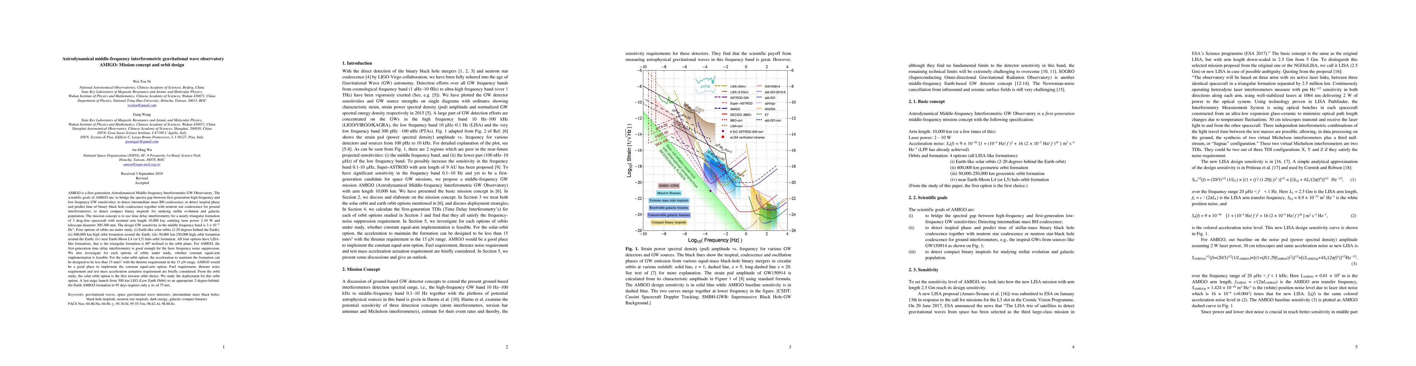 AMIGO is a first-generation Astrodynamical Middle-frequency Interferometric GW Observatory. The scientific goals of AMIGO are: to bridge the spectra gap between first-generation high-frequency and low-frequency GW sensitivities; to detect intermediate mass BH coalescence; to detect inspiral phase and predict time of binary black hole coalescence together with neutron star coalescence for ground interferometers; to detect compact binary inspirals for studying stellar evolution and galactic population. The mission concept is to use time delay interferometry for a nearly triangular formation of 3 drag-free spacecraft with nominal arm length 10,000 km, emitting laser power 2-10 W and telescope diameter 300-500 mm. The design GW sensitivity in the middle frequency band is 3 x 10^(-21) Hz^(-1/2). Both heliocentric and geocentric orbits are under study. All options have LISA-like formations, that is the triangular formation is 60 deg inclined to the orbit plane. For AMIGO, the first-generation time delay interferometry is good enough for the laser frequency noise suppression. We also investigate for each options of orbits under study, whether constant equal-arm implementation is feasible. For the solar-orbit option, the acceleration to maintain the formation can be designed to be less than 15 nm/s2 with the thruster requirement in the 15 {\mu}N range. AMIGO would be a good place to implement the constant equal-arm option. Fuel requirement, thruster noise requirement and test mass acceleration actuation requirement are briefly considered. From the orbit study, the solar orbit option is the first mission orbit choice. We study the deployment for this orbit option. A last-stage launch from 300 km LEO (Low Earth Orbit) to an appropriate 2-degree-behind-the-Earth AMIGO formation in 95 days requires only a {\delta}v of 75 m/s.