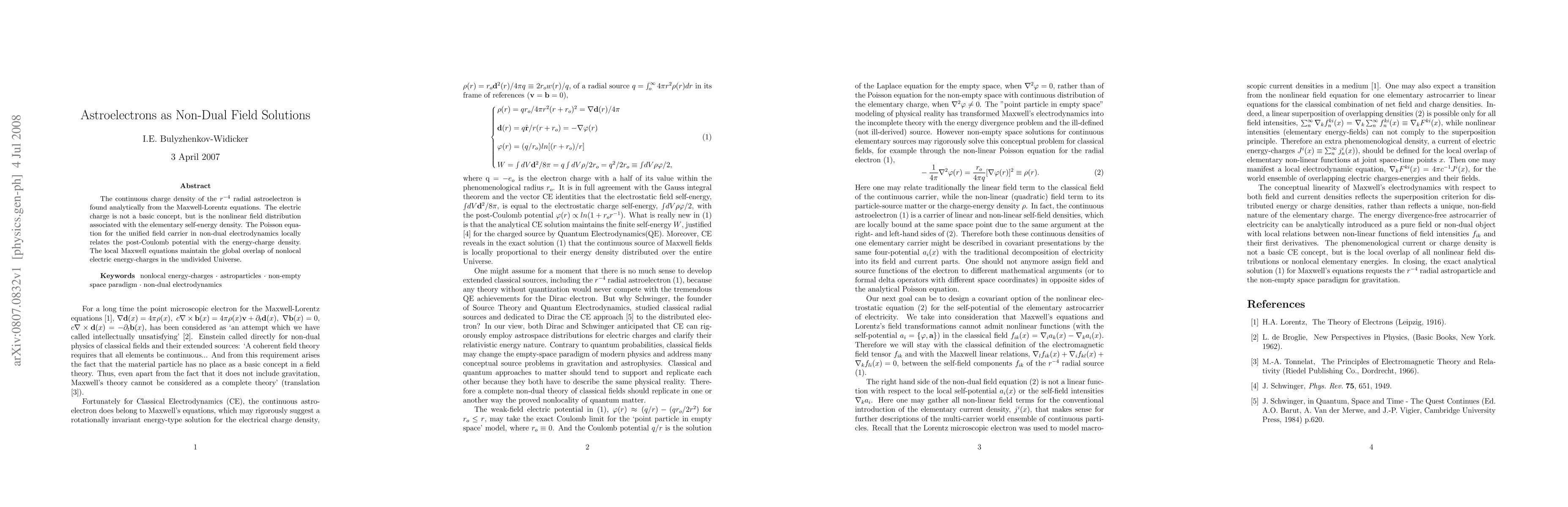 The continuous charge density of the r^{-4} radial astroelectron is found analytically from the Maxwell-Lorentz equations. The electric charge is not a basic concept, but is the nonlinear field distribution associated with the elementary self-energy density. The Poisson equation for the unified field carrier in non-dual electrodynamics locally relates the post-Coulomb potential with the energy-charge density. The local Maxwell equations maintain the global overlap of nonlocal electric energy-charges in the undivided Universe.
