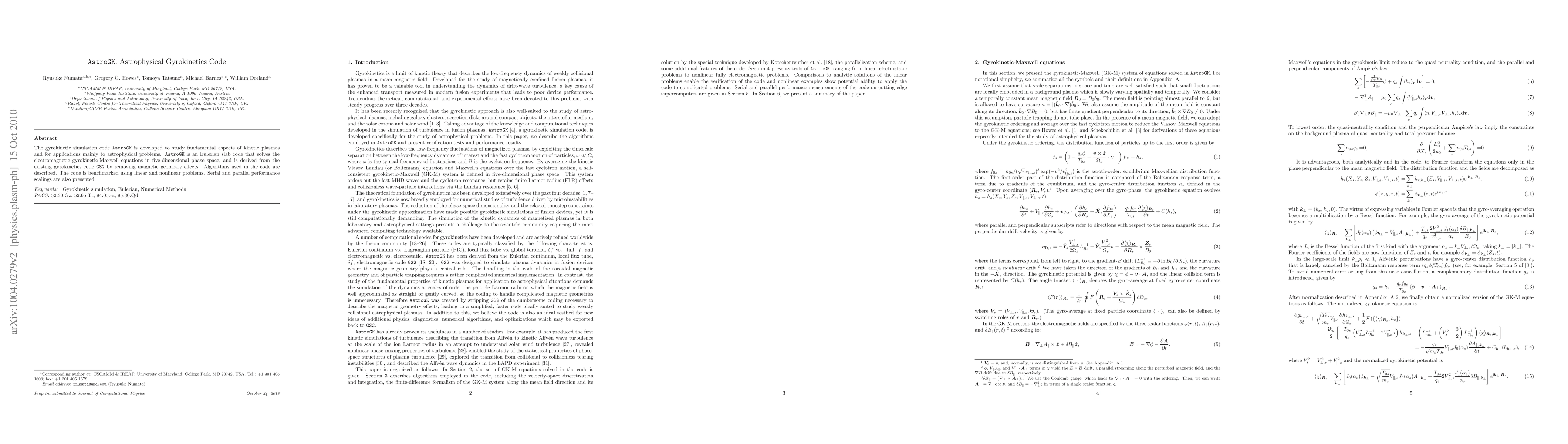 AstroGK is a gyrokinetic simulation code designed for studying kinetic plasmas and astrophysical applications, solving the electromagnetic Gyrokinetic-Maxwell equations in five-dimensional phase space. It is benchmarked for both linear and nonlinear problems, and demonstrates serial and parallel performance scalings.