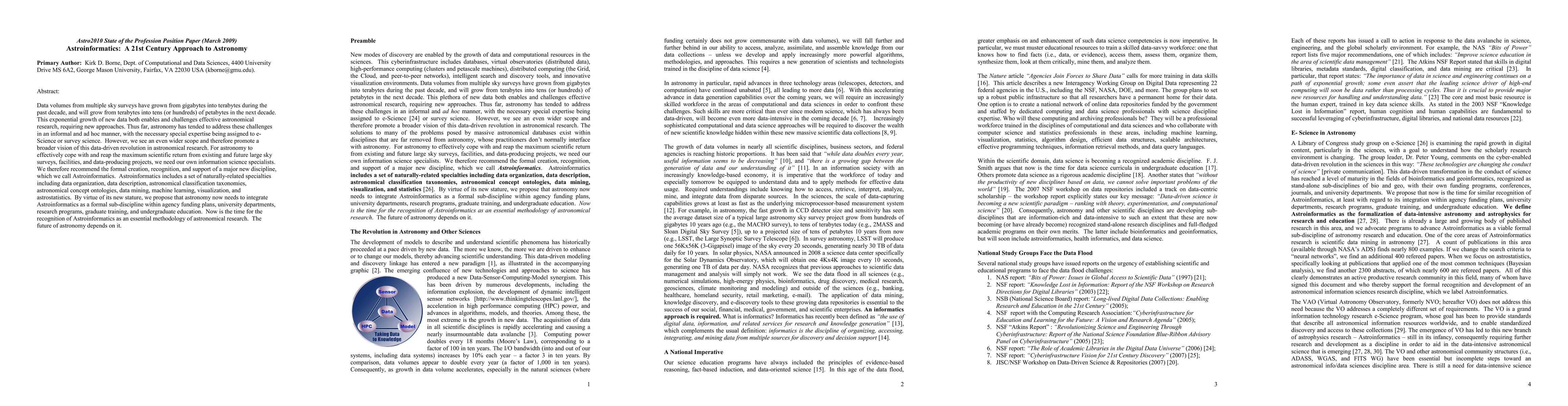 Data volumes from multiple sky surveys have grown from gigabytes into terabytes during the past decade, and will grow from terabytes into tens (or hundreds) of petabytes in the next decade. This exponential growth of new data both enables and challenges effective astronomical research, requiring new approaches. Thus far, astronomy has tended to address these challenges in an informal and ad hoc manner, with the necessary special expertise being assigned to e-Science or survey science. However, we see an even wider scope and therefore promote a broader vision of this data-driven revolution in astronomical research. For astronomy to effectively cope with and reap the maximum scientific return from existing and future large sky surveys, facilities, and data-producing projects, we need our own information science specialists. We therefore recommend the formal creation, recognition, and support of a major new discipline, which we call Astroinformatics. Astroinformatics includes a set of naturally-related specialties including data organization, data description, astronomical classification taxonomies, astronomical concept ontologies, data mining, machine learning, visualization, and astrostatistics. By virtue of its new stature, we propose that astronomy now needs to integrate Astroinformatics as a formal sub-discipline within agency funding plans, university departments, research programs, graduate training, and undergraduate education. Now is the time for the recognition of Astroinformatics as an essential methodology of astronomical research. The future of astronomy depends on it.