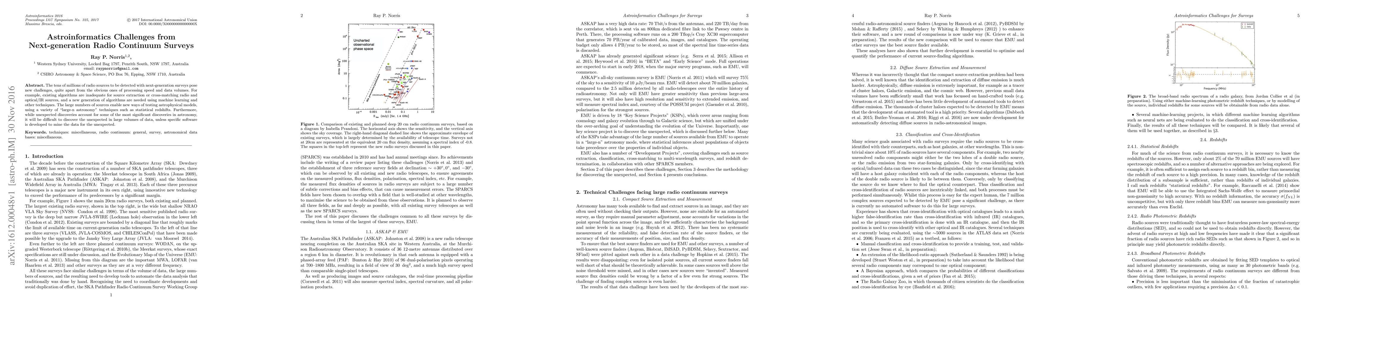 This paper discusses the challenges posed by next-generation radio continuum surveys, emphasizing the need for advanced algorithms to manage the vast amounts of data and improve source extraction and cross-matching. It highlights the potential for new discoveries using "large-n astronomy" techniques and stresses the importance of developing specialized software to uncover unexpected phenomena in the data.