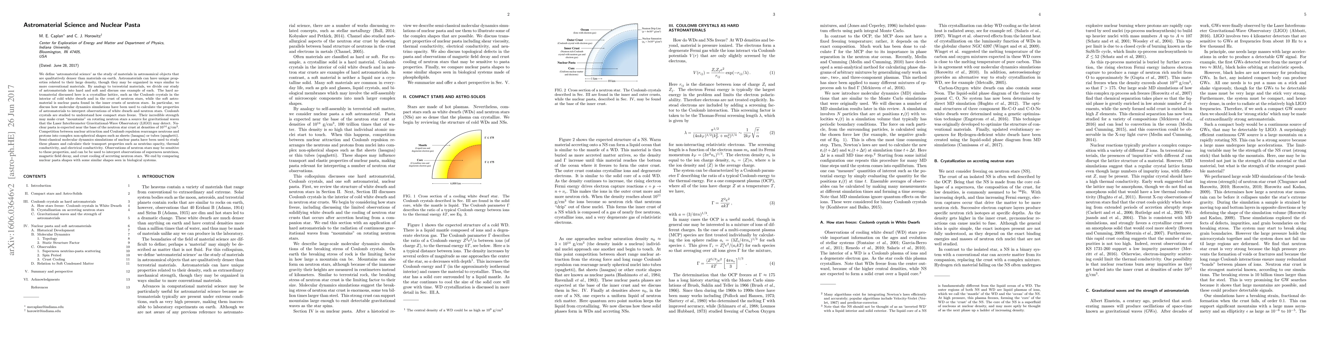 We define `astromaterial science' as the study of materials in astronomical objects that are qualitatively denser than materials on earth. Astromaterials can have unique properties related to their large density, though they may be organized in ways similar to more conventional materials. By analogy to terrestrial materials, we divide our study of astromaterials into hard and soft and discuss one example of each. The hard astromaterial discussed here is a crystalline lattice, such as the Coulomb crystals in the interior of cold white dwarfs and in the crust of neutron stars, while the soft astromaterial is nuclear pasta found in the inner crusts of neutron stars. In particular, we discuss how molecular dynamics simulations have been used to calculate the properties of astromaterials to interpret observations of white dwarfs and neutron stars. Coulomb crystals are studied to understand how compact stars freeze. Their incredible strength may make crust "mountains" on rotating neutron stars a source for gravitational waves that the Laser Interferometer Gravitational-Wave Observatory (LIGO) may detect. Nuclear pasta is expected near the base of the neutron star crust at densities of $10^{14}$ g/cm$^3$. Competition between nuclear attraction and Coulomb repulsion rearranges neutrons and protons into complex non-spherical shapes such as sheets (lasagna) or tubes (spaghetti). Semi-classical molecular dynamics simulations of nuclear pasta have been used to study these phases and calculate their transport properties such as neutrino opacity, thermal conductivity, and electrical conductivity. Observations of neutron stars may be sensitive to these properties, and can be be used to interpret observations of supernova neutrinos, magnetic field decay, and crust cooling of accreting neutron stars. We end by comparing nuclear pasta shapes with some similar shapes seen in biological systems.