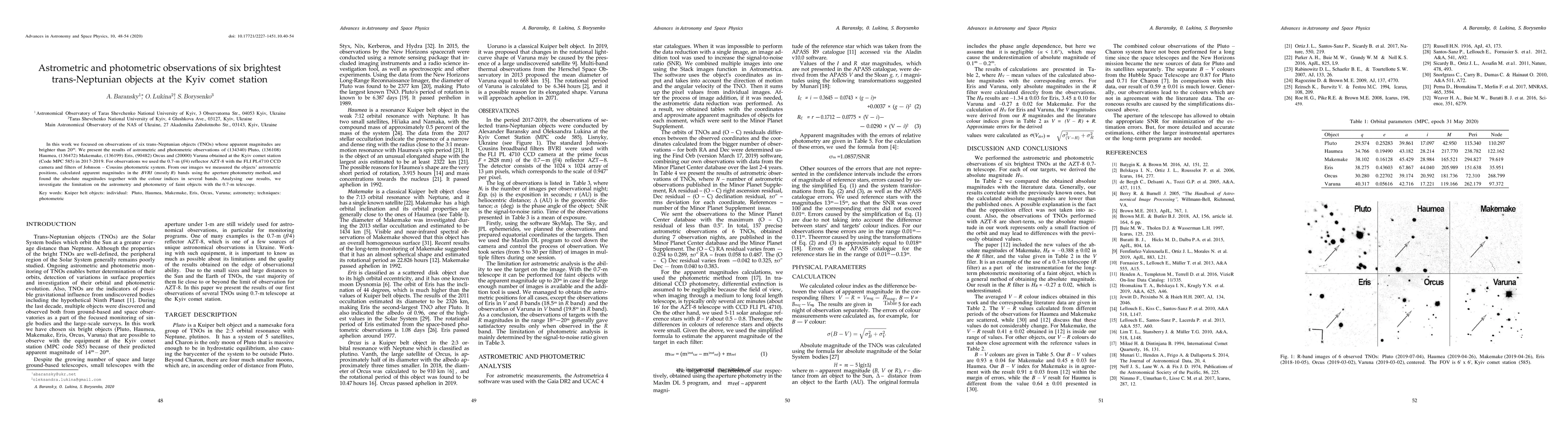 In this work, we focused on observations of six trans-Neptunian objects (TNOs) whose apparent magnitudes are brighter than 20 mag. We present the results of astrometric and photometric observations of (134340) Pluto, (136108) Haumea, (136472) Makemake, (136199) Eris, (90482) Orcus and (20000) Varuna obtained at the Kyiv comet station (Code MPC 585) in 2017-2019. For observations, we used the 0.7-m reflector AZT-8 with the FLI PL4710 CCD camera and filters of the Johnson-Cousins photometric system. From our images, we measured the objects astrometric positions, calculated apparent magnitudes in the BVRI (mostly R) bands using the aperture photometry method, and found the absolute magnitudes together with the colour indices in several bands. Analysing our results, we investigate the limitation on the astrometry and photometry of faint objects with the 0.7-m telescope.