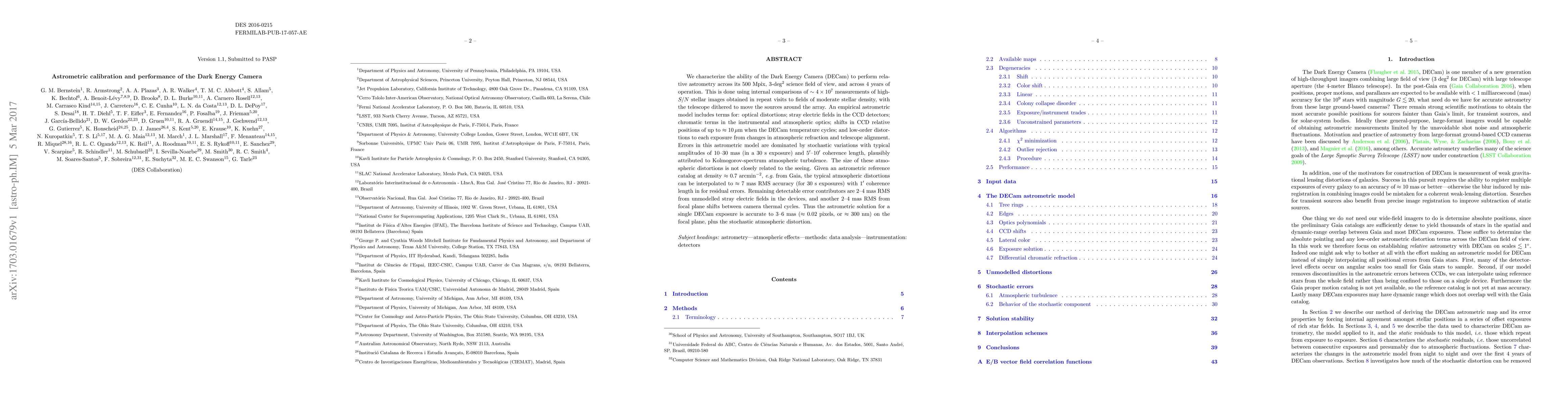 The Dark Energy Camera (DECam) achieves astrometric accuracy of 3-6 mas in single exposures, with atmospheric distortions contributing to additional 10-30 mas stochastic variations. Calibration using high-density stellar catalogs can reduce residual errors to 7 mas RMS.