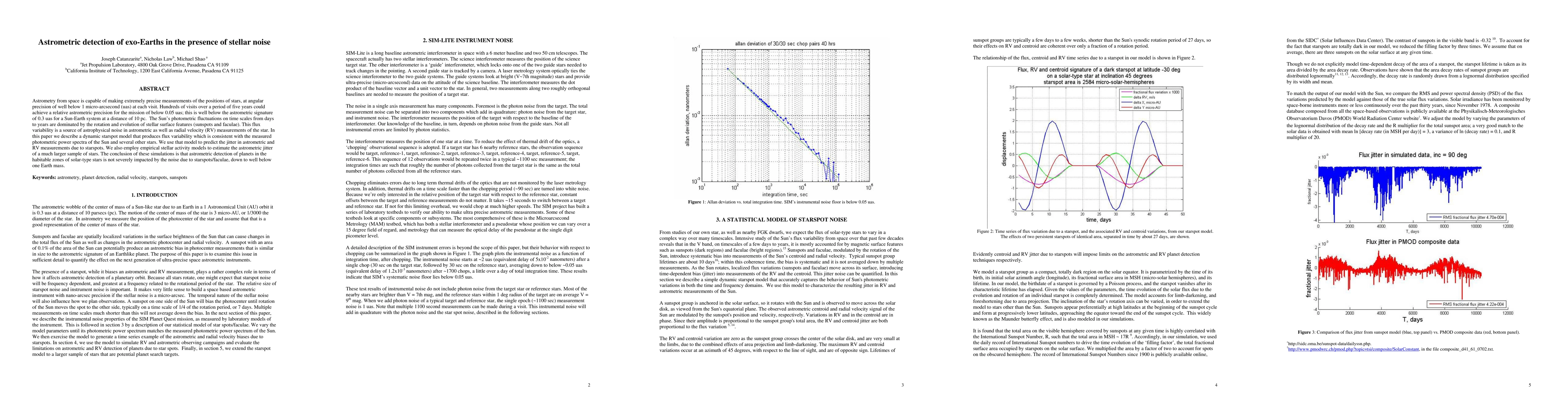 Space astrometry is capable of sub-microarcsecond measurements of star positions. A hundred visits over several years could yield relative astrometric precision of ~0.1 uas, below the astrometric signature (0.3 uas) of a Sun-Earth system at a distance of 10 parsecs. We investigate the impact of starspots on the detectability, via astrometric and radial velocity techniques, of Earthlike planets orbiting Sunlike stars. We find that for nearby stars, although starspot noise imposes severe restrictions on detectability by the radial velocity technique, it does not significantly affect astrometric detectability of habitable zone planets down to below an Earth mass.
