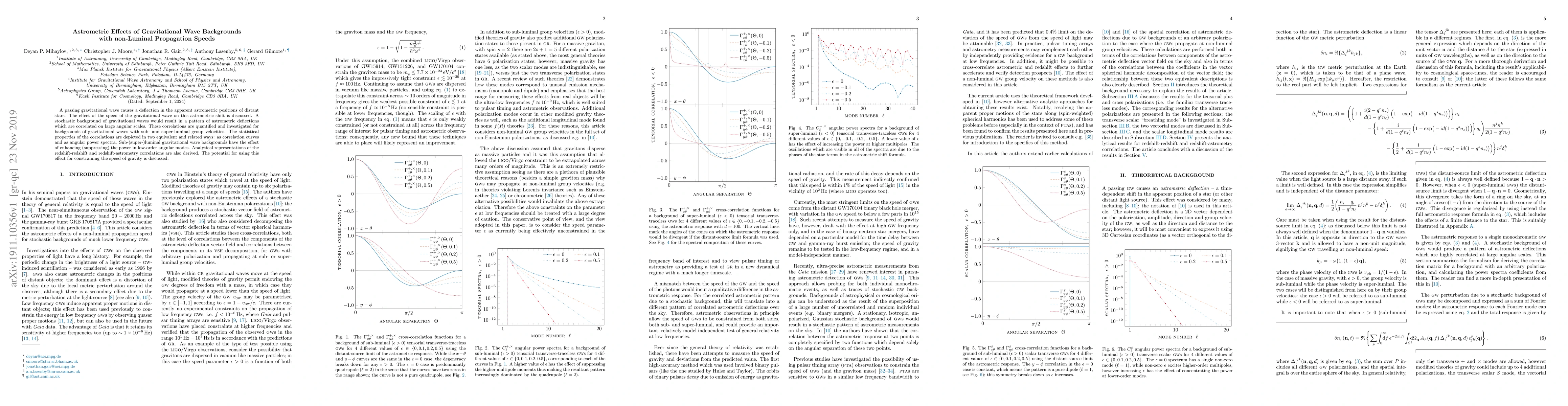 This paper investigates the astrometric effects caused by gravitational waves, particularly focusing on the influence of non-luminal propagation speeds on the apparent positions of stars. It quantifies the statistical correlations resulting from a stochastic background of gravitational waves, showing how sub- and super-luminal speeds affect angular power spectra.