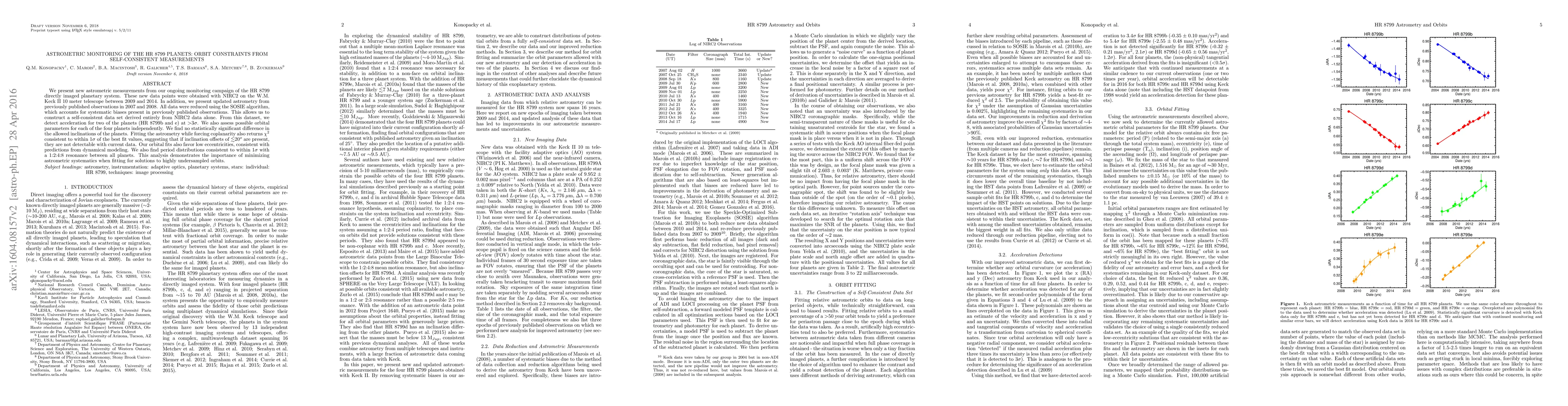 We present new astrometric measurements from our ongoing monitoring campaign of the HR 8799 directly imaged planetary system. These new data points were obtained with NIRC2 on the W.M. Keck II 10 meter telescope between 2009 and 2014. In addition, we present updated astrometry from previously published observations in 2007 and 2008. All data were reduced using the SOSIE algorithm, which accounts for systematic biases present in previously published observations. This allows us to construct a self-consistent data set derived entirely from NIRC2 data alone. From this dataset, we detect acceleration for two of the planets (HR 8799b and e) at $>$3$\sigma$. We also assess possible orbital parameters for each of the four planets independently. We find no statistically significant difference in the allowed inclinations of the planets. Fitting the astrometry while forcing coplanarity also returns $\chi^2$ consistent to within 1$\sigma$ of the best fit values, suggesting that if inclination offsets of $\lesssim$20$^{o}$ are present, they are not detectable with current data. Our orbital fits also favor low eccentricities, consistent with predictions from dynamical modeling. We also find period distributions consistent to within 1$\sigma$ with a 1:2:4:8 resonance between all planets. This analysis demonstrates the importance of minimizing astrometric systematics when fitting for solutions to highly undersampled orbits.