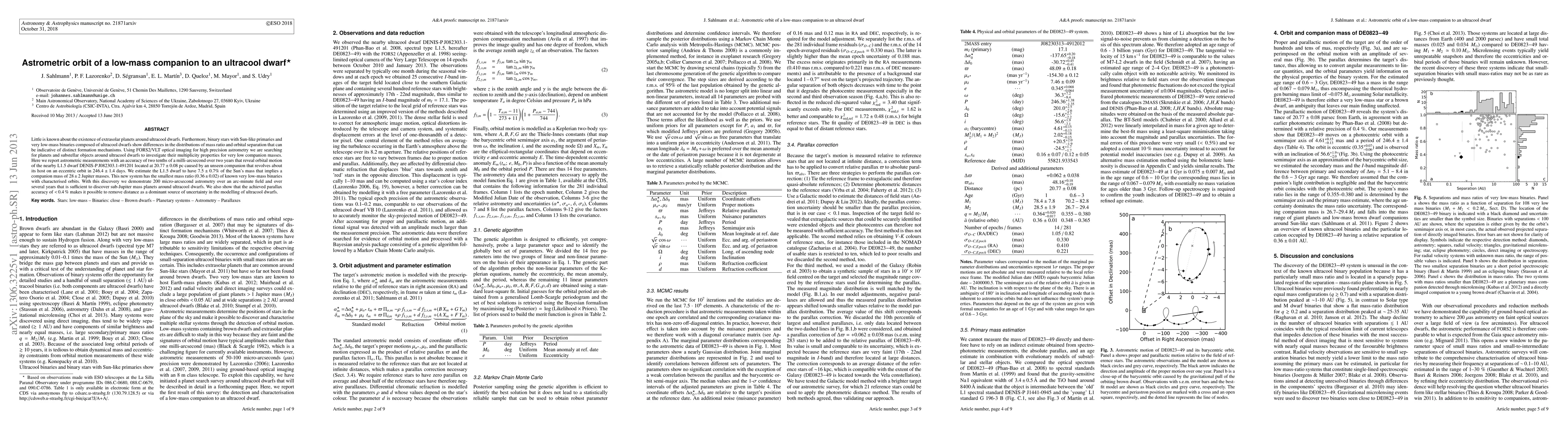 This paper reports the discovery of an unseen low-mass companion to the ultracool dwarf DENIS-P J082303.1-491201, revealing its orbital motion through high-precision astrometry. The companion, with a mass of 28 +/- 2 Jupiter masses, orbits the host on an eccentric path, providing insights into the multiplicity properties of ultracool dwarfs and demonstrating the capability for detecting sub-Jupiter mass planets around such stars.