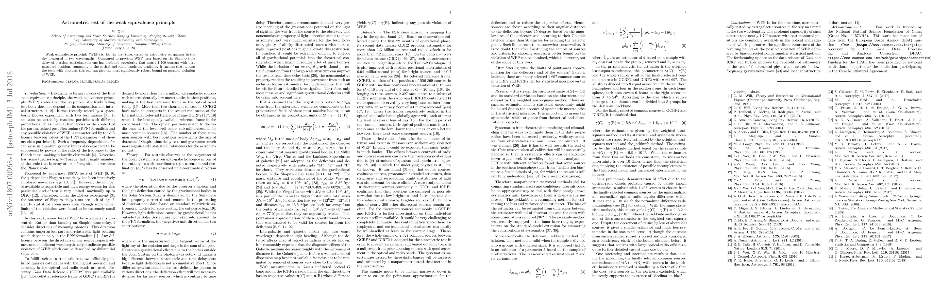 This paper presents a novel astrometric test of the weak equivalence principle (WEP) using quasars measured in optical and radio wavelengths, providing a robust and significant bound on possible WEP violations compared to previous tests based on Shapiro time delay. The study leverages nearly 1,700 quasars to achieve superior accuracy.