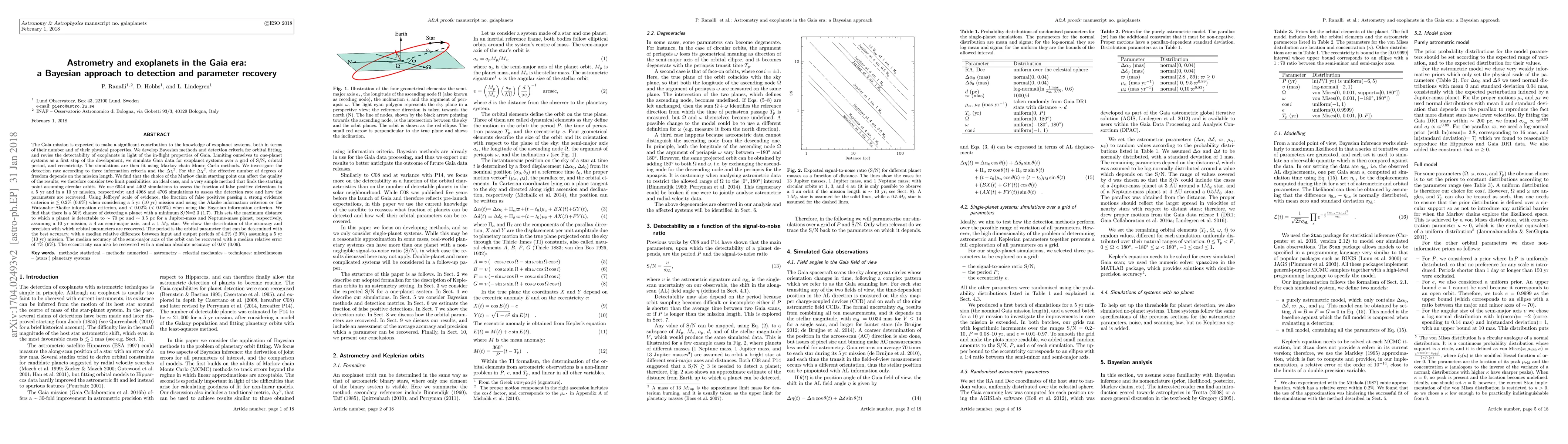 (abridged) We develop Bayesian methods and detection criteria for orbital fitting, and revise the detectability of exoplanets in light of the in-flight properties of Gaia. Limiting ourselves to one-planet systems as a first step of the development, we simulate Gaia data for exoplanet systems over a grid of S/N, orbital period, and eccentricity. The simulations are then fit using Markov chain Monte Carlo methods. We investigate the detection rate according to three information criteria and the delta chi^2. For the delta chi^2, the effective number of degrees of freedom depends on the mission length. We find that the choice of the Markov chain starting point can affect the quality of the results; we therefore consider two limit possibilities: an ideal case, and a very simple method that finds the starting point assuming circular orbits. Using Jeffreys' scale of evidence, the fraction of false positives passing a strong evidence criterion is < ~0.2% (0.6%) when considering a 5 yr (10 yr) mission and using the Akaike information criterion or the Watanabe-Akaike information criterion, and <0.02% (<0.06%) when using the Bayesian information criterion. We find that there is a 50% chance of detecting a planet with a minimum S/N=2.3 (1.7). This sets the maximum distance to which a planet is detectable to ~70 pc and ~3.5 pc for a Jupiter-mass and Neptune-mass planet, respectively, assuming a 10 yr mission, a 4 au semi-major axis, and a 1 M_sun star. The period is the orbital parameter that can be determined with the best accuracy, with a median relative difference between input and output periods of 4.2% (2.9%) assuming a 5 yr (10 yr) mission. The median accuracy of the semi-major axis of the orbit can be recovered with a median relative error of 7% (6%). The eccentricity can also be recovered with a median absolute accuracy of 0.07 (0.06).