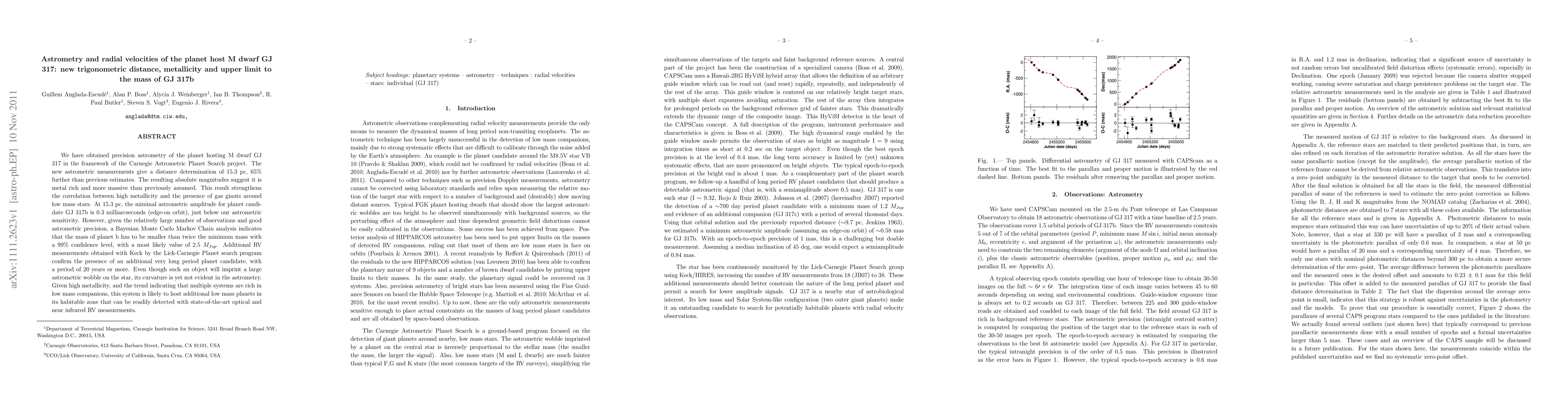 We have obtained precision astrometry of the planet hosting M dwarf GJ 317 in the framework of the Carnegie Astrometric Planet Search project. The new astrometric measurements give a distance determination of 15.3 pc, 65% further than previous estimates. The resulting absolute magnitudes suggest it is metal rich and more massive than previously assumed. This result strengthens the correlation between high metallicity and the presence of gas giants around low mass stars. At 15.3 pc, the minimal astrometric amplitude for planet candidate GJ 317b is 0.3 milliarcseconds (edge-on orbit), just below our astrometric sensitivity. However, given the relatively large number of observations and good astrometric precision, a Bayesian Monte Carlo Markov Chain analysis indicates that the mass of planet b has to be smaller than twice the minimum mass with a 99% confidence level, with a most likely value of 2.5 Mjup. Additional RV measurements obtained with Keck by the Lick-Carnegie Planet search program confirm the presence of an additional very long period planet candidate, with a period of 20 years or more. Even though such an object will imprint a large astrometric wobble on the star, its curvature is yet not evident in the astrometry. Given high metallicity, and the trend indicating that multiple systems are rich in low mass companions, this system is likely to host additional low mass planets in its habitable zone that can be readily detected with state-of-the-art optical and near infrared RV measurements.