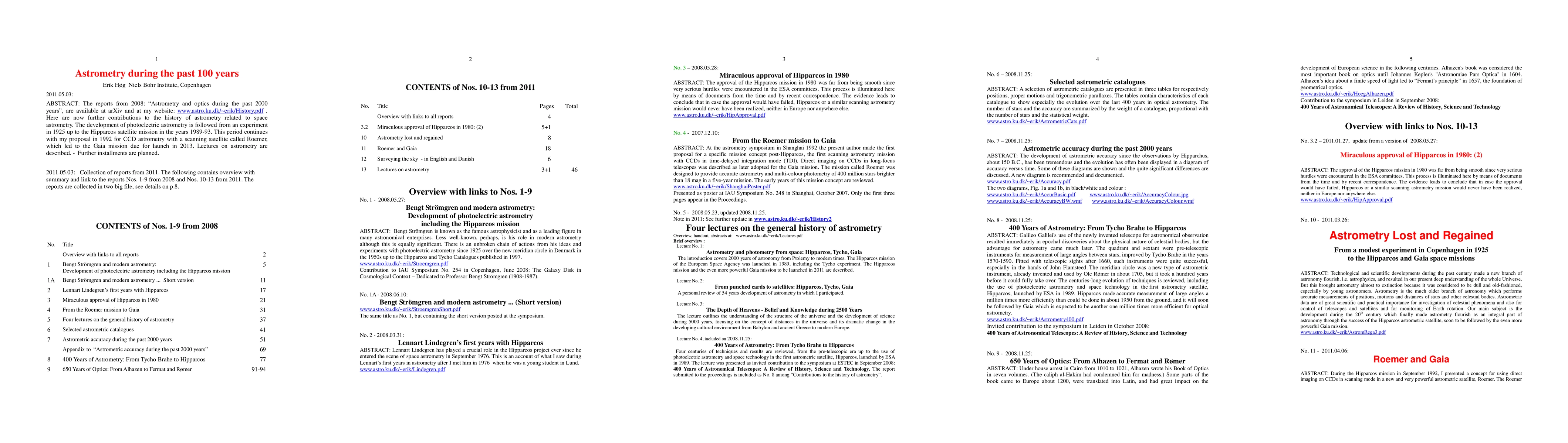 The reports from 2008: "Astrometry and optics during the past 2000 years", are available at arXiv and at my website: www.astro.ku.dk/~erik/History.pdf . Here are now further contributions to the history of astrometry related to space astrometry. The development of photoelectric astrometry is followed from an experiment in 1925 up to the Hipparcos satellite mission in the years 1989-93. This period continues with my proposal in 1992 for CCD astrometry with a scanning satellite called Roemer, which led to the Gaia mission due for launch in 2013. Lectures on astrometry are described. - Further installments are planned.