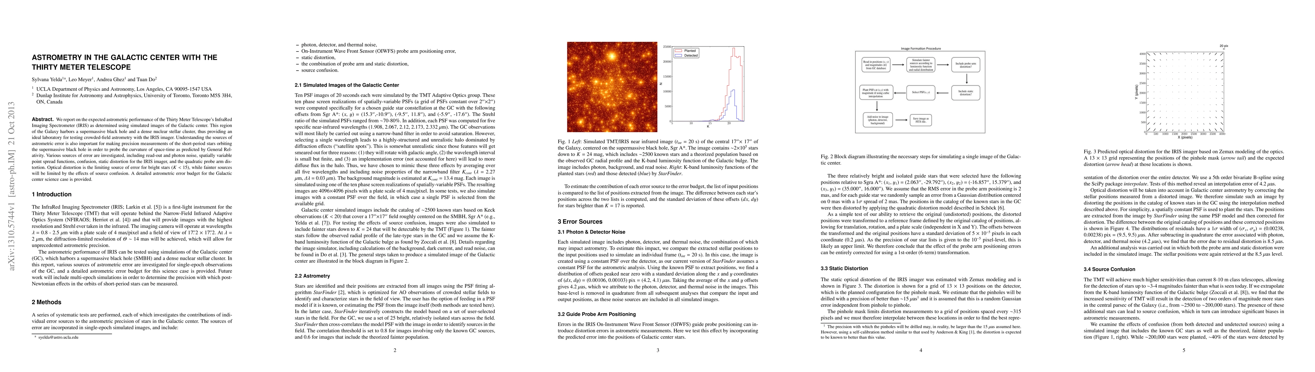 This paper evaluates the expected astrometric performance of the Thirty Meter Telescope's IRIS imager for the Galactic center, identifying optical distortion as the primary error source for bright stars and confusion for fainter ones. It provides a detailed error budget crucial for precision measurements of stars orbiting the supermassive black hole.