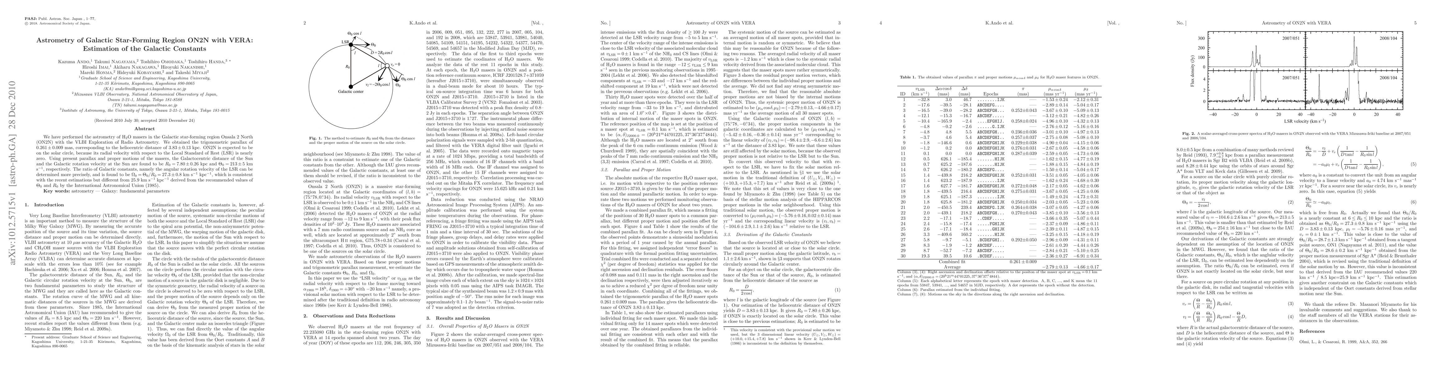 This paper uses astrometry of H2O masers in the ON2N star-forming region with VERA to determine the heliocentric distance and Galactic constants. The findings suggest a heliocentric distance of 3.83±0.13 kpc and refine the Galactic rotation velocity at the Sun to Omega_0=27.3±0.8 km/s/kpc, differing from previous IAU estimates.