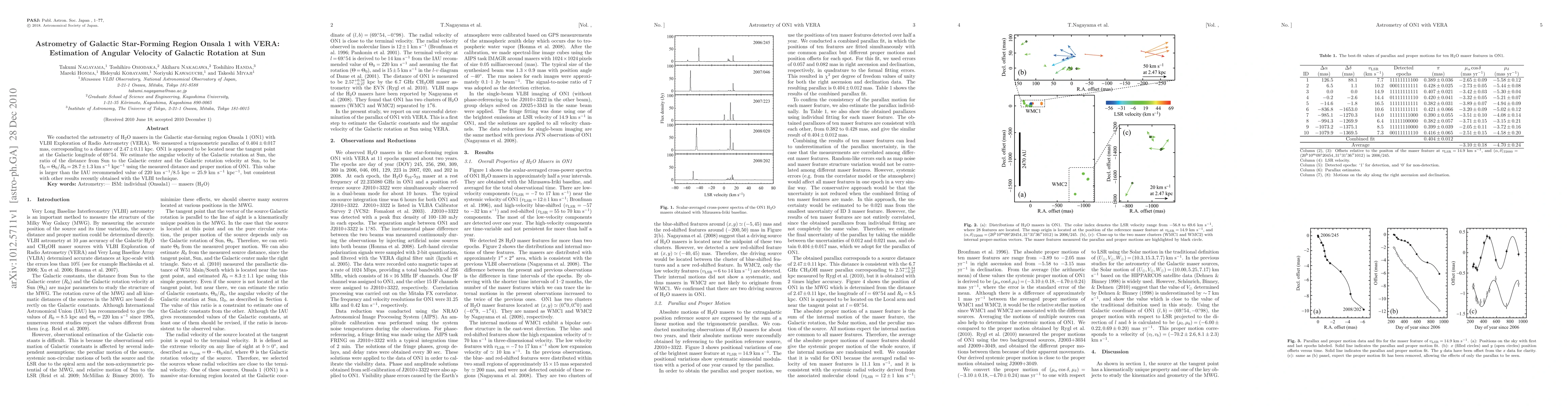 This paper uses VERA to measure astrometry of H2O masers in the Onsala 1 star-forming region, determining a distance of 2.47 kpc and estimating the Galactic rotation angular velocity at the Sun as 28.7±1.3 km/s/kpc, higher than the IAU recommended value but consistent with recent VLBI results.
