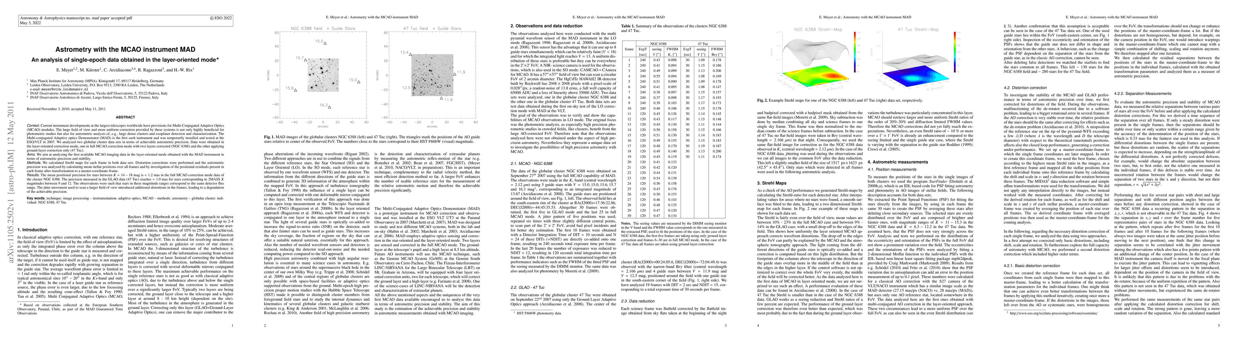 Context: Current instrument developments at the largest telescopes worldwide have provisions for Multi-Conjugated Adaptive Optics (MCAO) modules. The large field of view and more uniform correction provided by these systems is not only highly beneficial for photometric studies but also for astrometric analysis of, e.g., large dense clusters and exoplanet detection and characterization. The Multi-conjugated Adaptive optics Demonstrator (MAD) is the first such instrument and was temporarily installed and tested at the ESO/VLT in 2007. We analyzed two globular cluster data sets in terms of achievable astrometric precision. Data were obtained in the layer-oriented correction mode, one in full MCAO correction mode with two layers corrected (NGC 6388) and the other applying ground-layer correction only (47 Tuc). Aims: We aim at analyzing the first available MCAO imaging data in the layer-oriented mode obtained with the MAD instrument in terms of astrometric precision and stability. Methods: We calculated Strehl maps for each frame in both data sets. Distortion corrections were performed and the astrometric precision was analyzed by calculating mean stellar positions over all frames and by investigation of the positional residuals present in each frame after transformation to a master-coordinate-frame. Results: The mean positional precision for stars between K = 14-18 mag is ~1.2 mas in the full MCAO correction mode data of the cluster NGC 6388. The precision measured in the GLAO data (47 Tuc) reaches ~1.0 mas for stars corresponding to 2MASS K magnitudes between 9 and 12. The observations were such that stars in these magnitude ranges correspond to the same detector flux range. The jitter movement used to scan a larger field of view introduced additional distortions in the frames, leading to a degradation of the achievable precision.