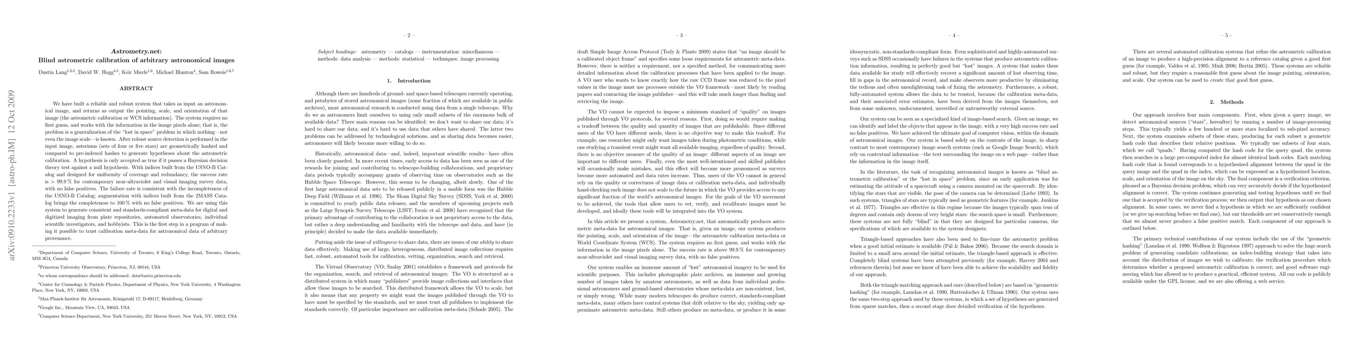 We have built a reliable and robust system that takes as input an astronomical image, and returns as output the pointing, scale, and orientation of that image (the astrometric calibration or WCS information). The system requires no first guess, and works with the information in the image pixels alone; that is, the problem is a generalization of the "lost in space" problem in which nothing--not even the image scale--is known. After robust source detection is performed in the input image, asterisms (sets of four or five stars) are geometrically hashed and compared to pre-indexed hashes to generate hypotheses about the astrometric calibration. A hypothesis is only accepted as true if it passes a Bayesian decision theory test against a background hypothesis. With indices built from the USNO-B Catalog and designed for uniformity of coverage and redundancy, the success rate is 99.9% for contemporary near-ultraviolet and visual imaging survey data, with no false positives. The failure rate is consistent with the incompleteness of the USNO-B Catalog; augmentation with indices built from the 2MASS Catalog brings the completeness to 100% with no false positives. We are using this system to generate consistent and standards-compliant meta-data for digital and digitized imaging from plate repositories, automated observatories, individual scientific investigators, and hobbyists. This is the first step in a program of making it possible to trust calibration meta-data for astronomical data of arbitrary provenance.