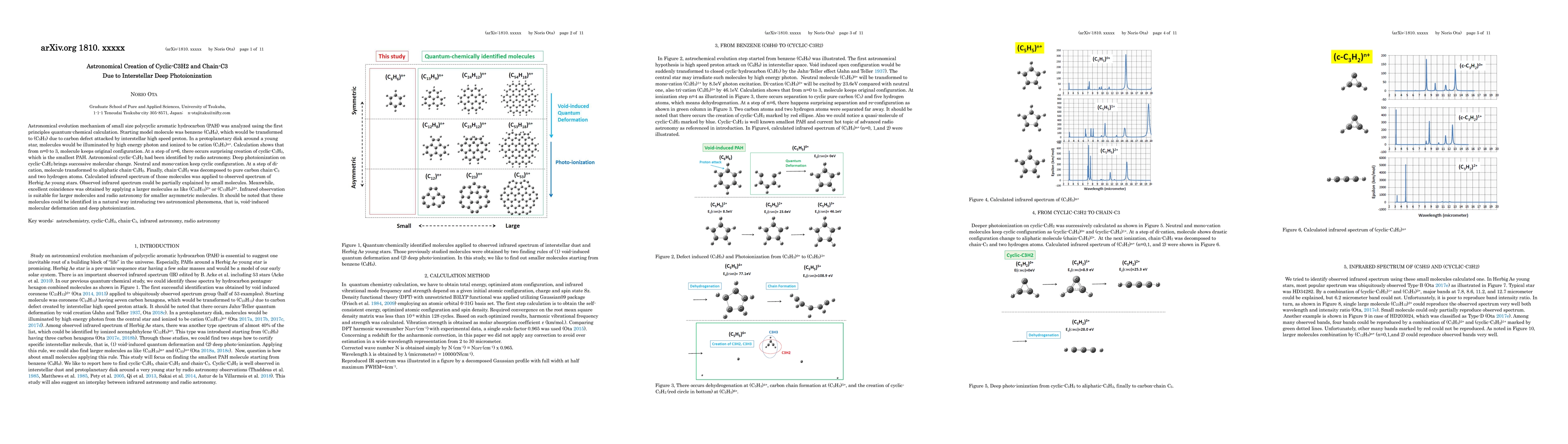 Astronomical evolution mechanism of small size polycyclic aromatic hydrocarbon (PAH) was analyzed using the first principles quantum-chemical calculation. Starting model molecule was benzene (C6H6), which would be transformed to (C5H5) due to carbon void created by interstellar high speed proton attack. In a protoplanetary disk around a young star, molecules would be illuminated by high energy photon and ionized to be cationic-(C5H5). Calculation shows that from neutral to tri-cation, molecule keeps original configuration. At a step of sixth cation, there occurs surprising creation of cyclic-C3H2, which is the smallest PAH. Astronomical cyclic-C3H2 had been identified by radio astronomy. Deep photoionization of cyclic-C3H2 brings successive molecular change. Neutral and mono-cation keep cyclic configuration. At a step of di-cation, molecule was transformed to aliphatic chain-C3H2. Finally, chain-C3H2 was decomposed to pure carbon chain-C3 and two hydrogen atoms. Calculated infrared spectrum of those molecules was applied to observed spectrum of Herbig Ae young stars. Observed infrared spectrum could be partially explained by small molecules. Meanwhile, excellent coincidence was obtained by applying a larger molecules as like (C23H12)2+ or (C12H8)2+. Infrared observation is suitable for larger molecules and radio astronomy for smaller asymmetric molecules. It should be noted that these molecules could be identified in a natural way introducing two astronomical phenomena, that is, void-induced molecular deformation and deep photoionization.