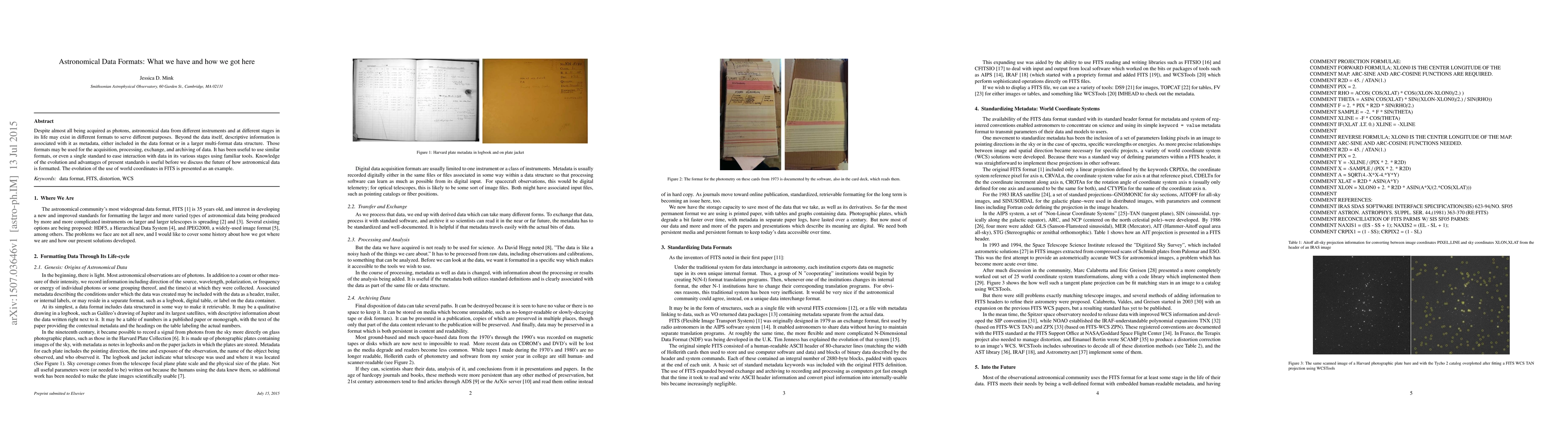 Despite almost all being acquired as photons, astronomical data from different instruments and at different stages in its life may exist in different formats to serve different purposes. Beyond the data itself, descriptive information is associated with it as metadata, either included in the data format or in a larger multi-format data structure. Those formats may be used for the acquisition, processing, exchange, and archiving of data. It has been useful to use similar formats, or even a single standard to ease interaction with data in its various stages using familiar tools. Knowledge of the evolution and advantages of present standards is useful before we discuss the future of how astronomical data is formatted. The evolution of the use of world coordinates in FITS is presented as an example.