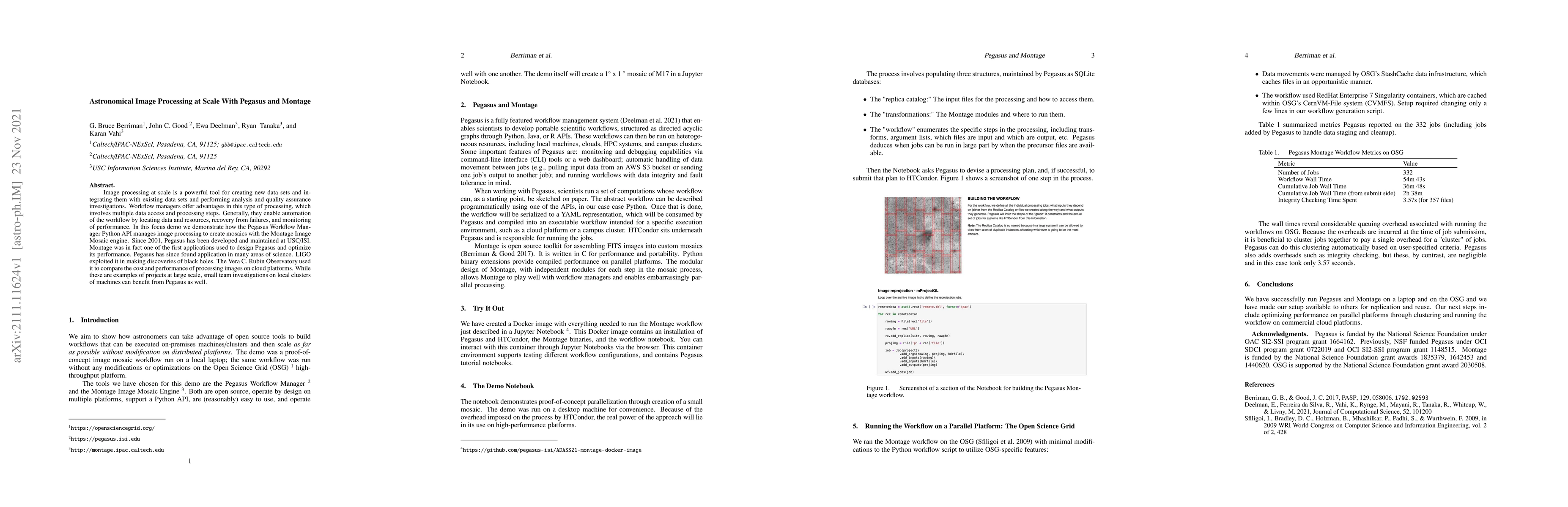 This paper demonstrates the use of Pegasus Workflow Manager and Montage for large-scale astronomical image processing, showcasing automation, data integration, and performance monitoring. It highlights Pegasus's versatility across various scientific projects, from black hole discoveries to cloud-based image processing comparisons.