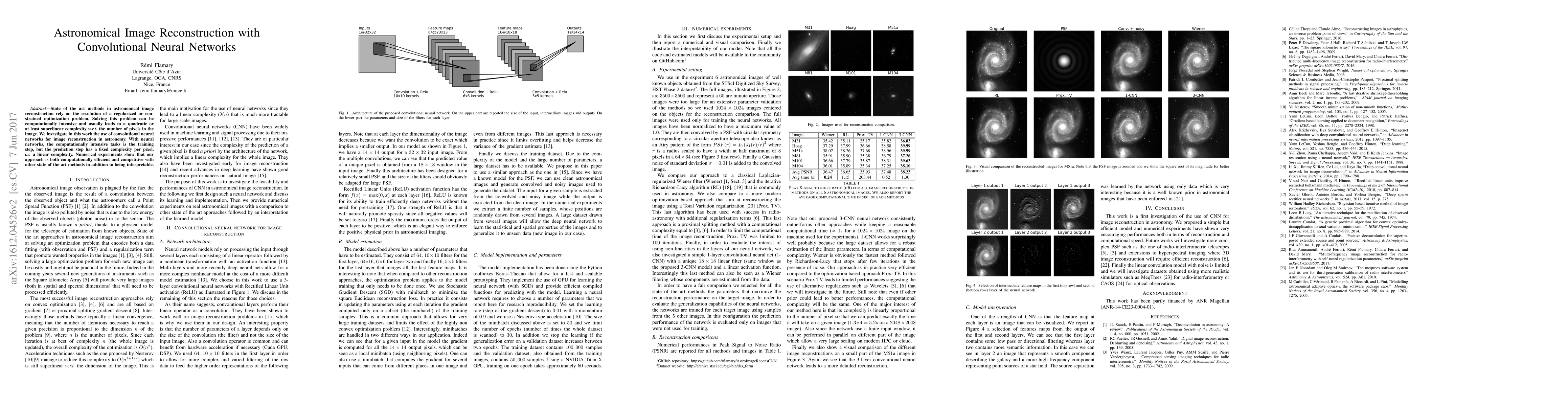 This paper explores the use of convolutional neural networks (CNNs) for astronomical image reconstruction, demonstrating that while training is computationally intensive, the prediction step is efficient with linear complexity per pixel. Experiments show CNNs are competitive and more efficient than traditional methods.