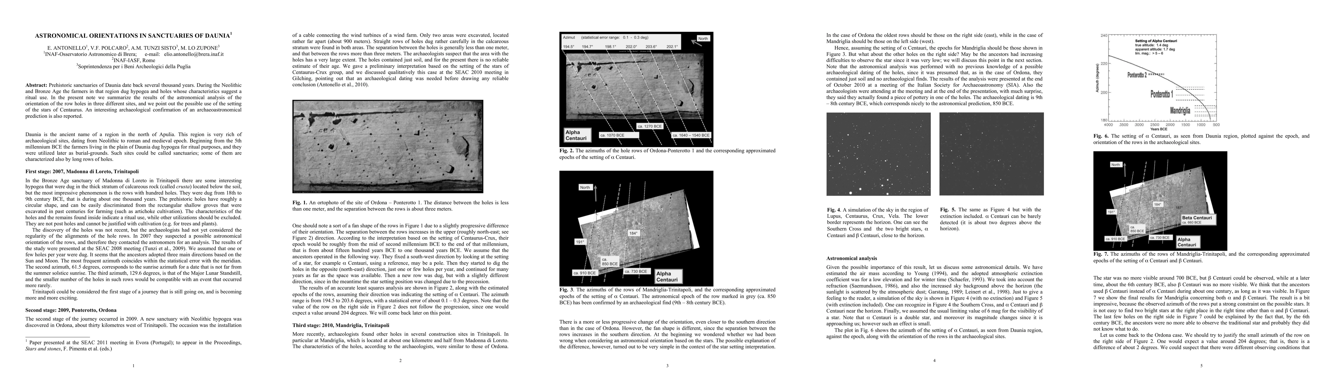 Prehistoric sanctuaries of Daunia date back several thousand years. During the Neolithic and Bronze Age the farmers in that region dug hypogea and holes whose characteristics suggest a ritual use. In the present note we summarize the results of the astronomical analysis of the orientation of the row holes in three different sites, and we point out the possible use of the setting of the stars of Centaurus. An interesting archaeological confirmation of an archaeoastronomical prediction is also reported.