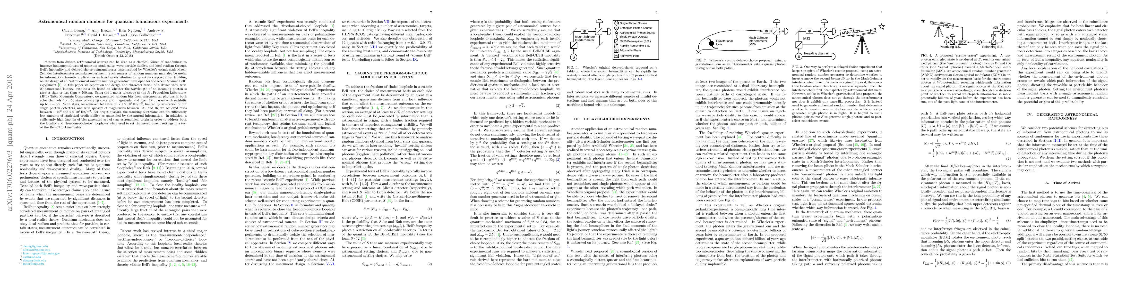 Photons from distant astronomical sources can be used as a classical source of randomness to improve fundamental tests of quantum nonlocality, wave-particle duality, and local realism through Bell's inequality and delayed-choice quantum eraser tests inspired by Wheeler's cosmic-scale Mach-Zehnder interferometer gedankenexperiment. Such sources of random numbers may also be useful for information-theoretic applications such as key distribution for quantum cryptography. Building on the design of an "astronomical random-number generator" developed for the recent "cosmic Bell" experiment [Handsteiner et al., Phys. Rev. Lett. 118, 060401 (2017)], in this paper we report on the design and characterization of a device that, with 20-nanosecond latency, outputs a bit based on whether the wavelength of an incoming photon is greater than or less than 700 nm. Using the one-meter telescope at the Jet Propulsion Laboratory (JPL) Table Mountain Observatory, we generated random bits from astronomical photons in both color channels from 50 stars of varying color and magnitude, and from 12 quasars with redshifts up to $z = 3.9$. With stars, we achieved bit rates of $\sim 1 \times 10^6$ Hz / m$^2$, limited by saturation for our single-photon detectors, and with quasars of magnitudes between 12.9 and 16, we achieved rates between $\sim 10^2$ and $2 \times 10^3$ Hz /m$^2$. For bright quasars, the resulting bitstreams exhibit sufficiently low amounts of statistical predictability as quantified by the mutual information. In addition, a sufficiently high fraction of bits generated are of true astronomical origin in order to address both the locality and freedom-of-choice loopholes when used to set the measurement settings in a test of the Bell-CHSH inequality.