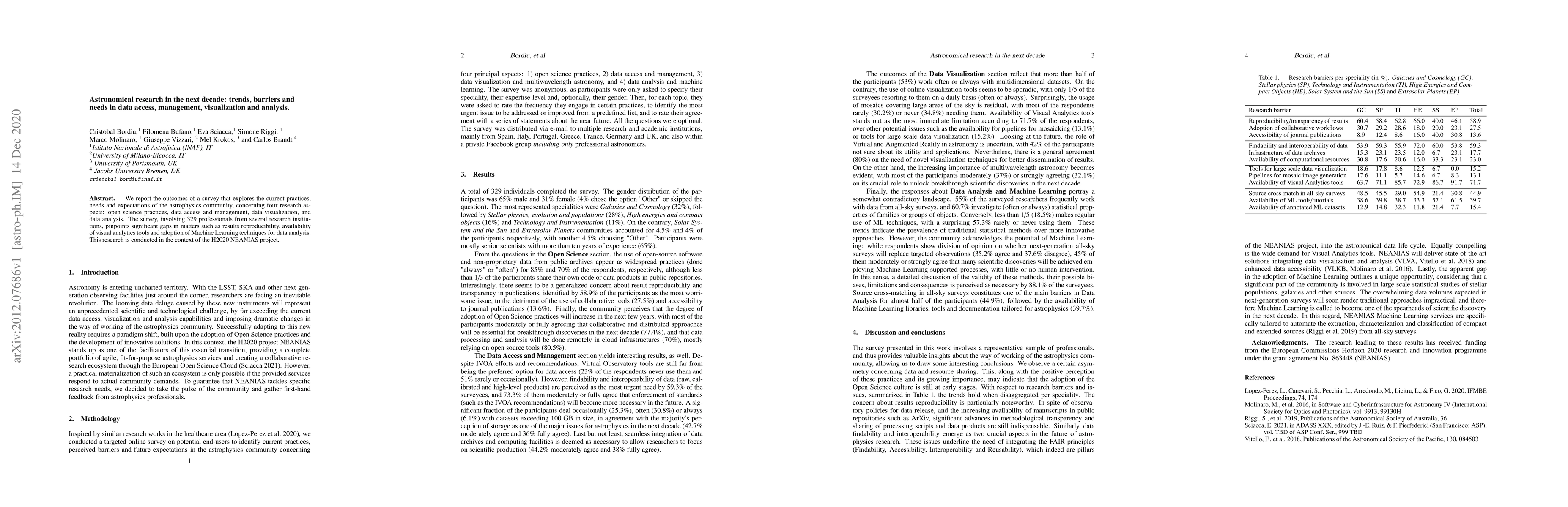 We report the outcomes of a survey that explores the current practices, needs and expectations of the astrophysics community, concerning four research aspects: open science practices, data access and management, data visualization, and data analysis. The survey, involving 329 professionals from several research institutions, pinpoints significant gaps in matters such as results reproducibility, availability of visual analytics tools and adoption of Machine Learning techniques for data analysis. This research is conducted in the context of the H2020 NEANIAS project.
