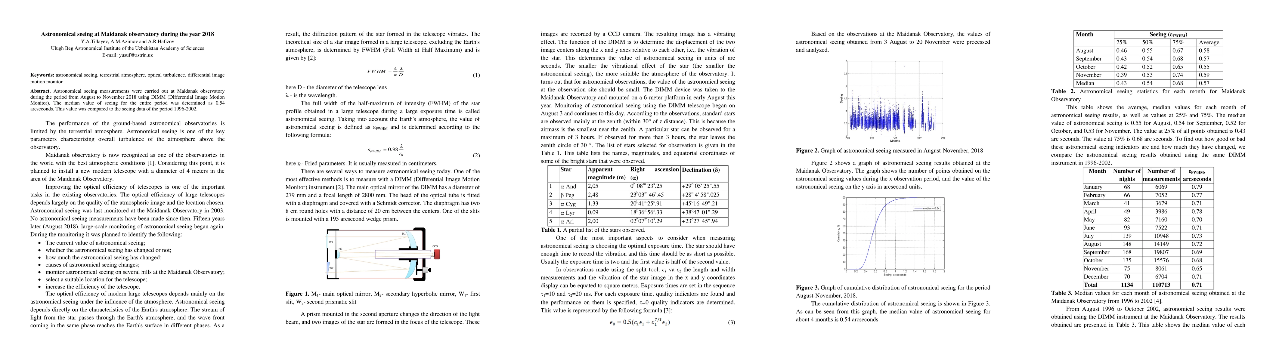 Astronomical seeing at Maidanak Observatory showed a median value of 0.54 arcseconds in 2018, slightly worse than the previous period (1996-2002). The DIMM method provided accurate measurements for this study.