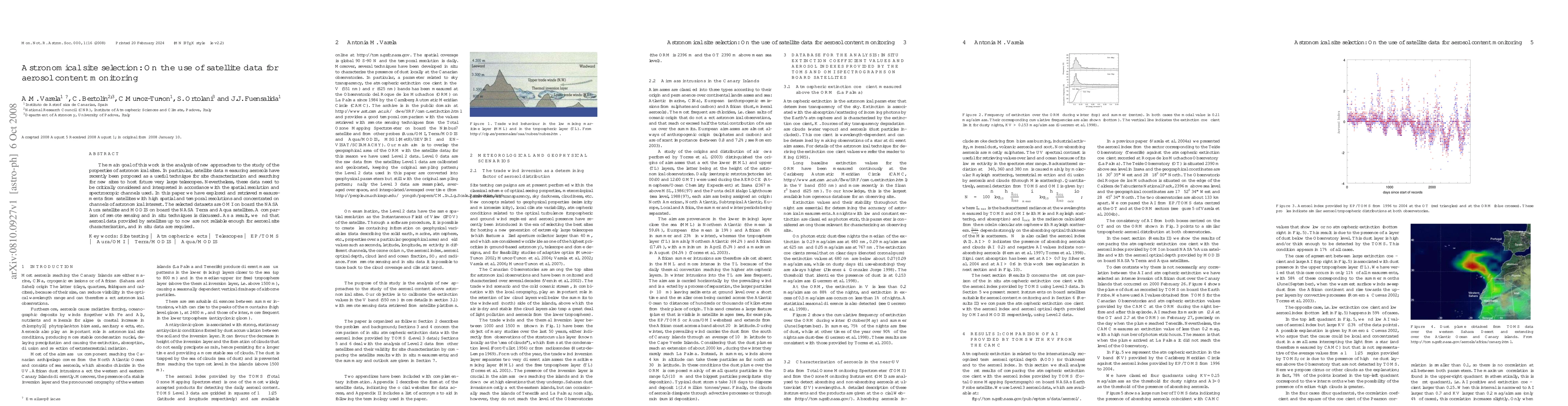 This paper examines the use of satellite data for monitoring aerosols to characterize astronomical sites for future telescopes. Despite high-resolution satellite data from OMI and MODIS, the study finds that satellite aerosol data are insufficiently reliable and recommends in situ measurements for accurate site characterization.