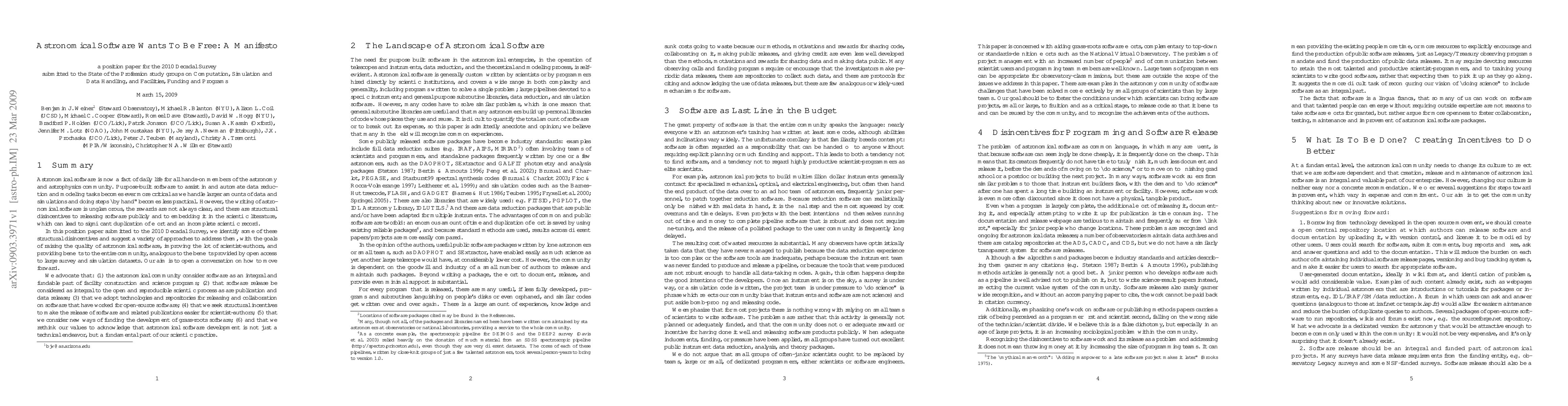 Astronomical software is now a fact of daily life for all hands-on members of our community. Purpose-built software for data reduction and modeling tasks becomes ever more critical as we handle larger amounts of data and simulations. However, the writing of astronomical software is unglamorous, the rewards are not always clear, and there are structural disincentives to releasing software publicly and to embedding it in the scientific literature, which can lead to significant duplication of effort and an incomplete scientific record. We identify some of these structural disincentives and suggest a variety of approaches to address them, with the goals of raising the quality of astronomical software, improving the lot of scientist-authors, and providing benefits to the entire community, analogous to the benefits provided by open access to large survey and simulation datasets. Our aim is to open a conversation on how to move forward. We advocate that: (1) the astronomical community consider software as an integral and fundable part of facility construction and science programs; (2) that software release be considered as integral to the open and reproducible scientific process as are publication and data release; (3) that we adopt technologies and repositories for releasing and collaboration on software that have worked for open-source software; (4) that we seek structural incentives to make the release of software and related publications easier for scientist-authors; (5) that we consider new ways of funding the development of grass-roots software; (6) and that we rethink our values to acknowledge that astronomical software development is not just a technical endeavor, but a fundamental part of our scientific practice.