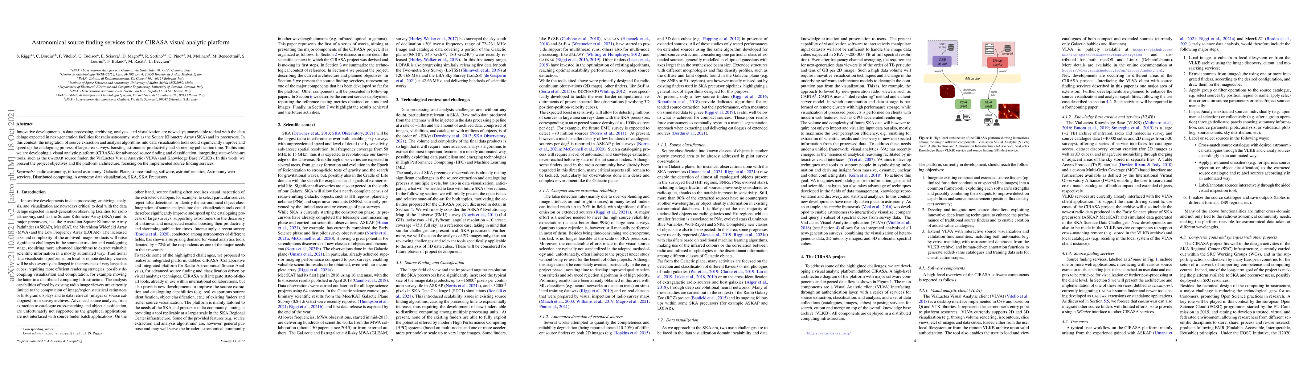 This paper discusses the development of the CIRASA visual analytic platform aimed at enhancing source finding and classification in radio astronomy. It integrates advanced tools like the CAESAR source finder and focuses on improving the cataloguing process for large area surveys, thereby boosting astronomer productivity and reducing publication time.