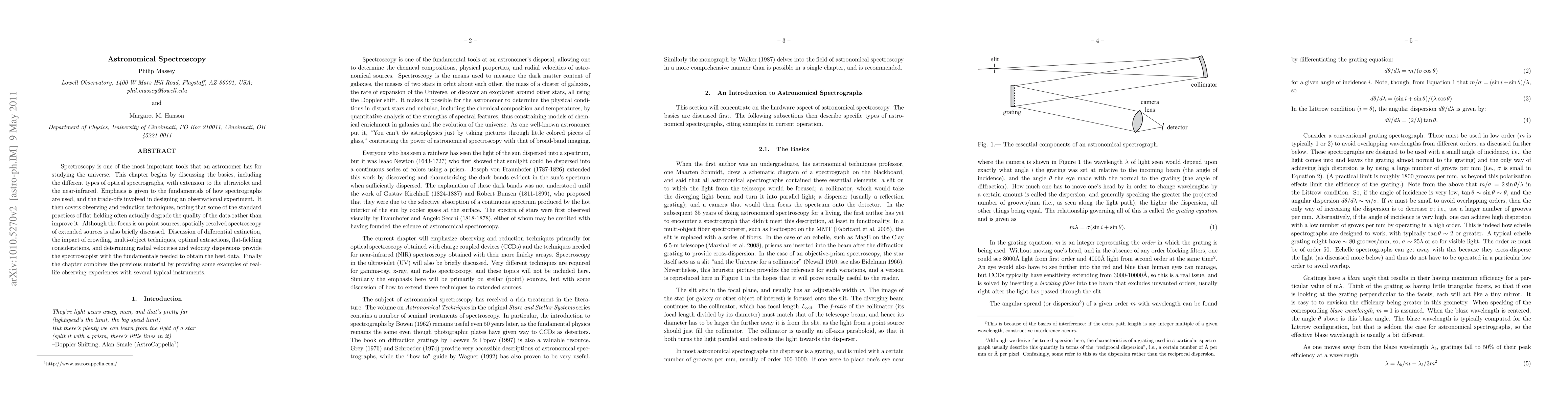 This chapter discusses the basics of astronomical spectroscopy, including types of spectrographs and techniques for observing and reducing data, to help astronomers obtain high-quality spectra. It covers key considerations such as differential extinction, crowding, and flat-fielding to provide a comprehensive guide for spectroscopists.