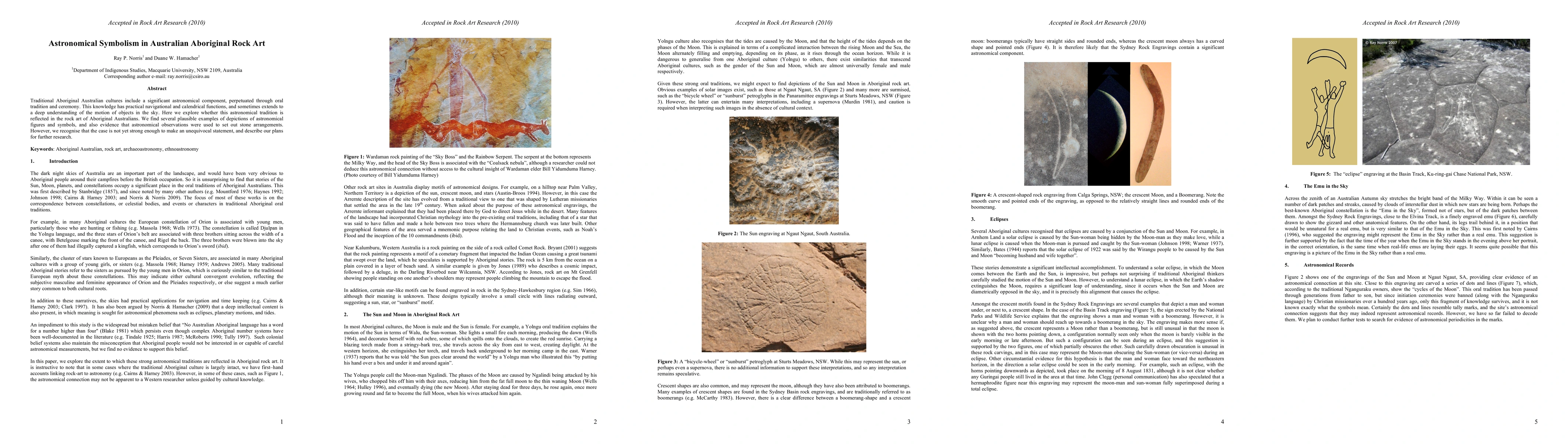 This study investigates the presence of astronomical symbolism in Australian Aboriginal rock art, finding plausible depictions of celestial figures and evidence of astronomical observations influencing stone arrangements, though further research is needed to confirm these findings.