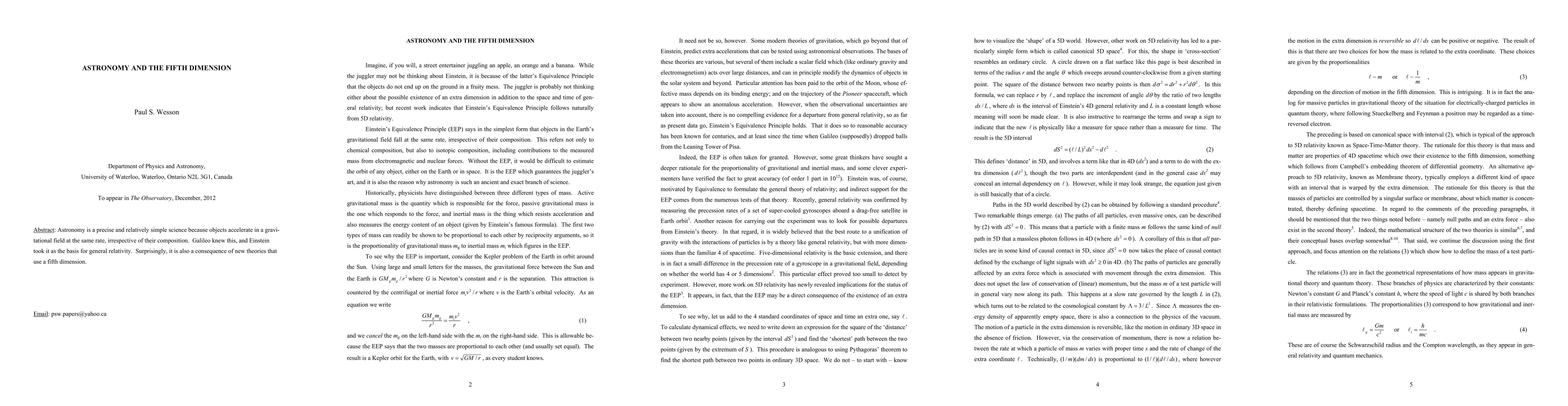 Summary: This paper explores how the principle of uniform acceleration in a gravitational field, foundational to general relativity, can also be explained by theories incorporating a fifth dimension, suggesting a new perspective on fundamental astronomical principles.